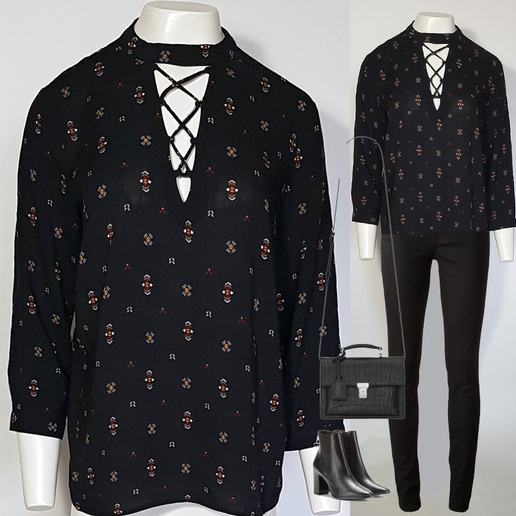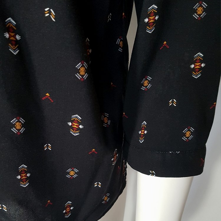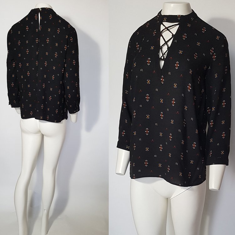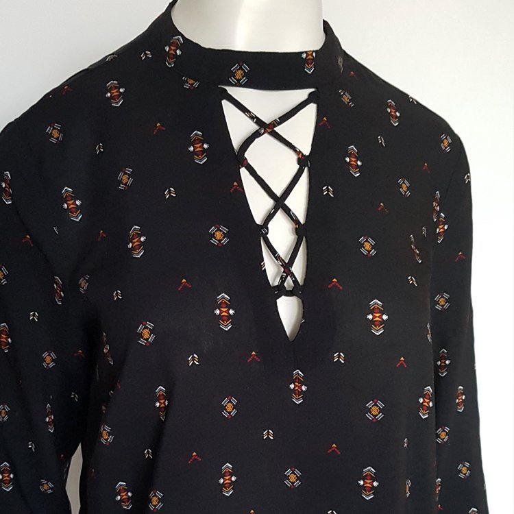 Bluzka damska we wzór etno, dekolt sznurowany przy szyi wykończony niską stójką, rękawy 3/4, zapinana z tyłu na guzik.