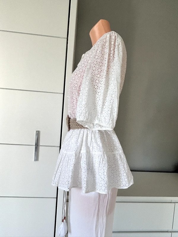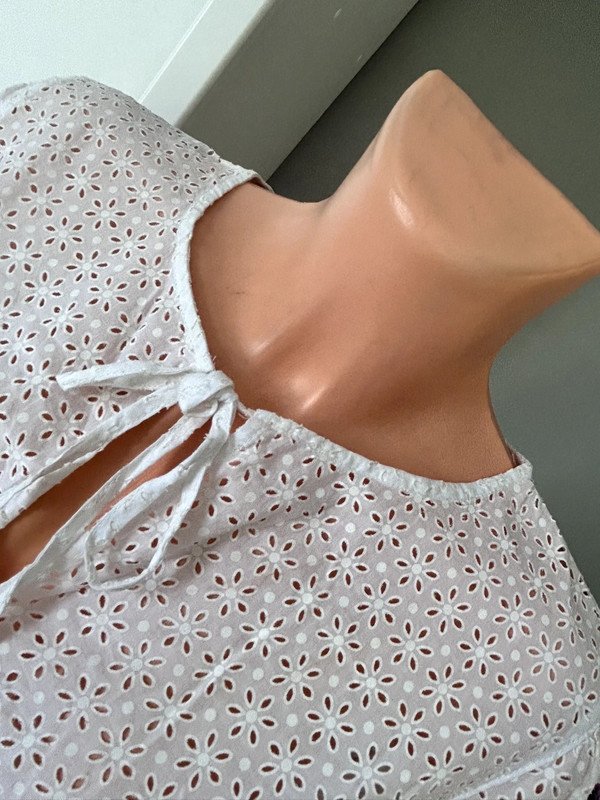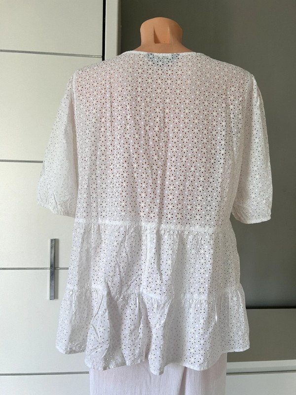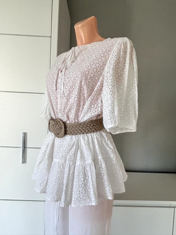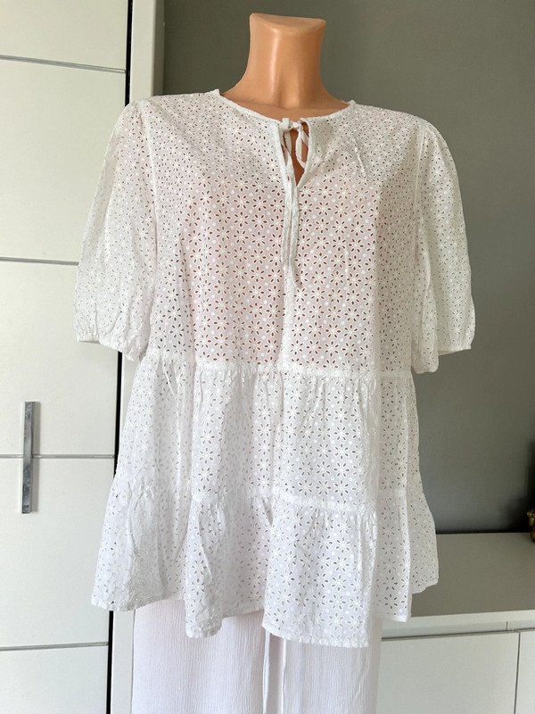 Bluzka firmy F&F, 100 % bawełna, cieniutka, przewiewna, idealna na letnie upały. Rozmiar 46 XXXL, może być noszona jako oversize na mniejszych rozmiarach. Bufiaste rękawy, falbany, dekolt wiązany przy szyi. Kolor ecru, hafty, mereżka. Wakacyjna klasyka, old money style, szafa kapsułowa. Polecam