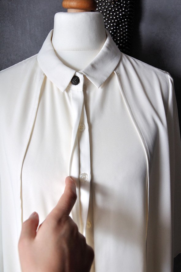 Z kołnierzykiem, zapinana na plastikowe, perłowo mieniące się guziki pod samą szyję. Guziki przykryte są listwą materiału, oprócz tego pod kołnierzykiem - ten jest mosiężny, ozdobny, wysadzany maleńkimi, czarnymi cyrkoniami.