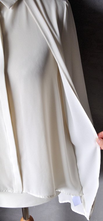 Ma dwie długości: przód krótszy, na bokach ma doszyte dłuższe poły materiału, które układają się trochę jak kamizelka. Rozszerzana ku dołowi.