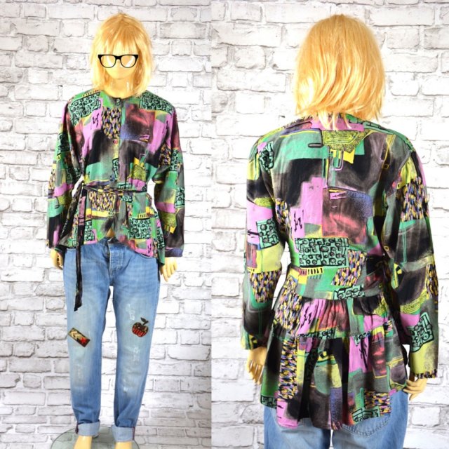 Efektowna kolorowa bluzka w formie fraka z dłuższym tylem i krótszym przodem, zapinana na guziczki, w pasie dodatkowo wiązana.