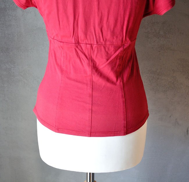 Pod biustem odcięta i uszyta tak, jakby pionowo wzdłuż talii biegły fiszbiny (to tylko szwy, bluzka nie jest usztywniona) - są one z przodu i z tyłu.