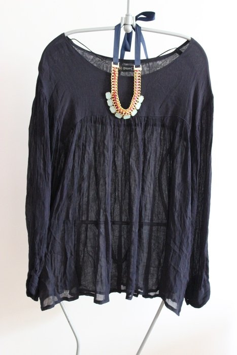 Bluzka granatowa, mgiełka. Firama Dyanne. Rozmiar 44/XXL. Wymiary: obwód biustu-67cmx2, szerokość dołu-97cmx2, długość-73cm.