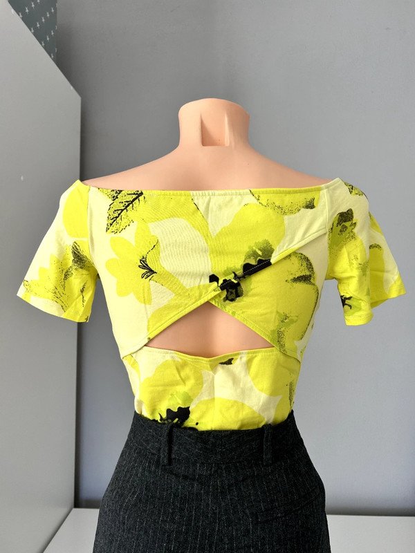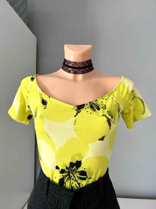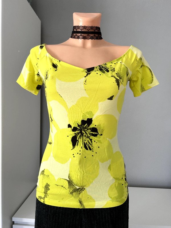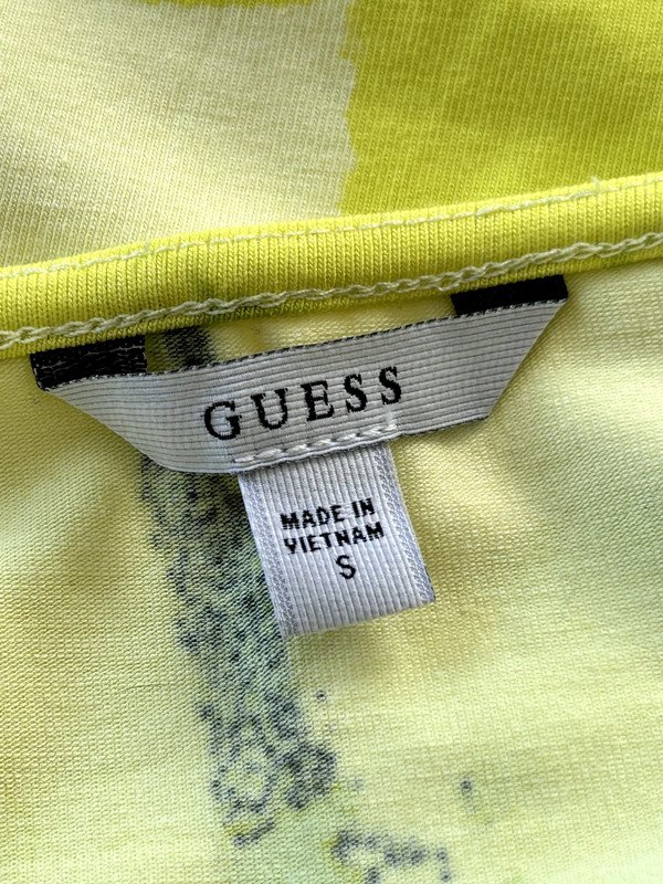 Limonkowa, elastyczna bluzka firmy Guess rozmiar S. Duży dekolt, wycięcie na plecach. Naturalny skład: bawełna i modal czyli przewiewna. Polecam