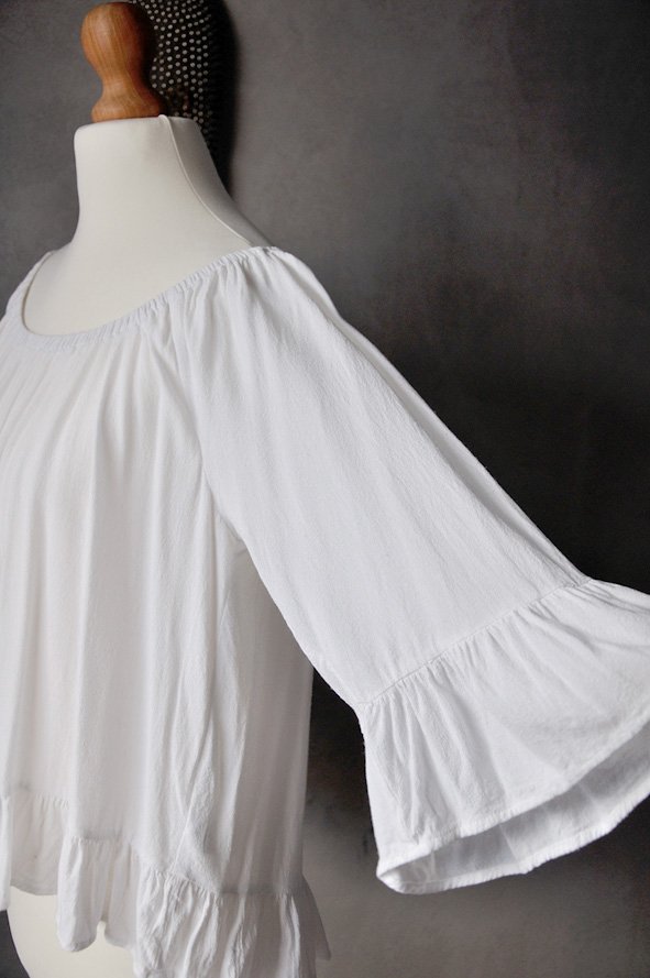 Rękawy do łokcia. Rękawy i spód bluzki wykończone falbaną.