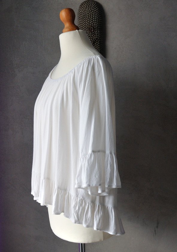 Uszyta z cienkiej, miękkiej, lejącej wiskozy w kolorze białym.