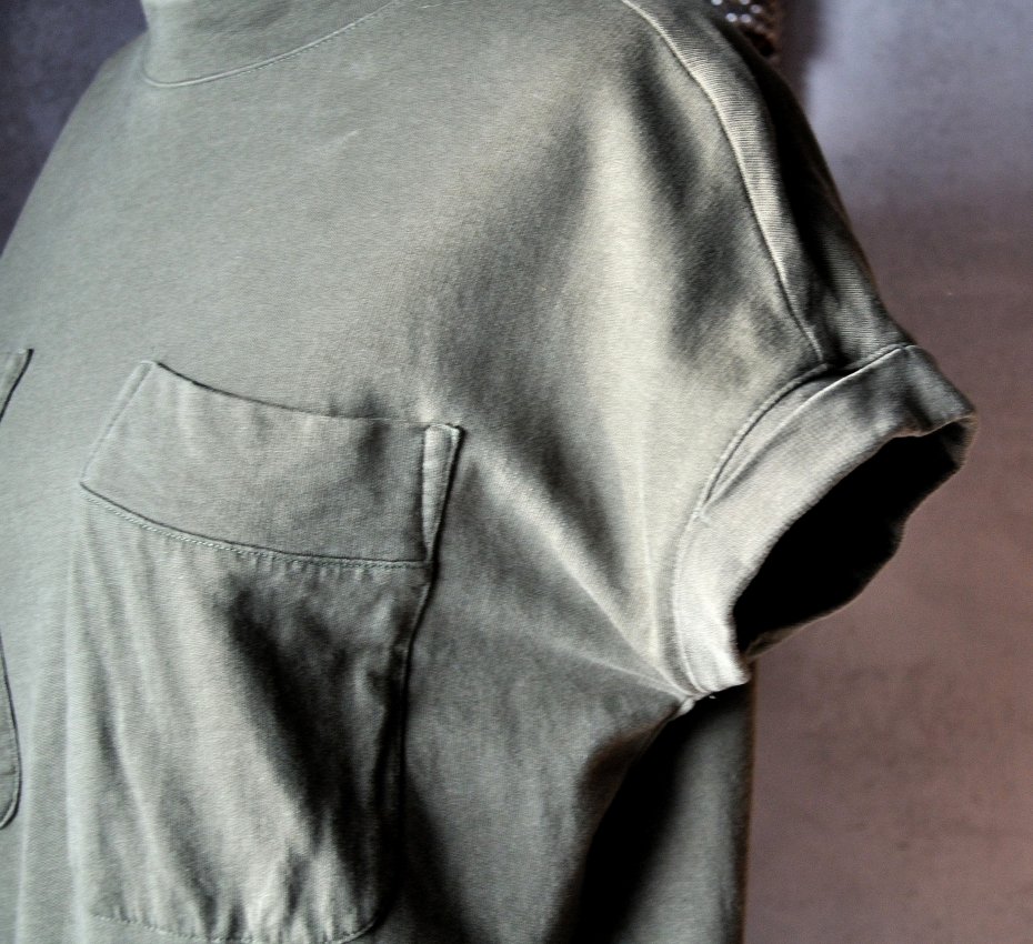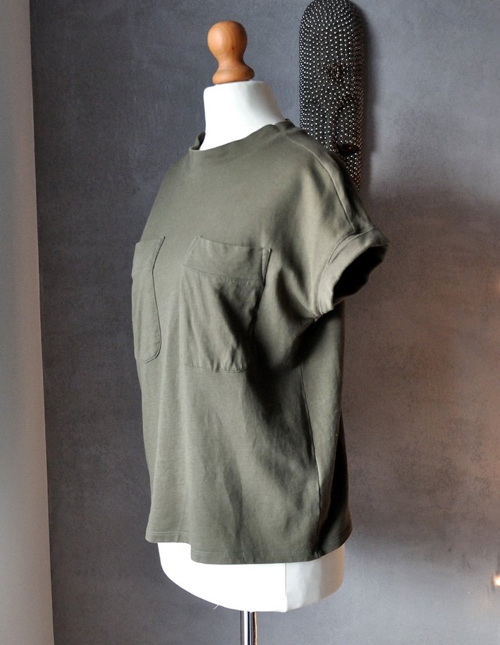 Wokół dekoltu mini golf. Rękawki zawinięte. Na piersiach naszyte kieszenie.