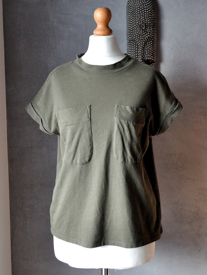 Wokół dekoltu mini golf. Rękawki zawinięte. Na piersiach naszyte kieszenie.