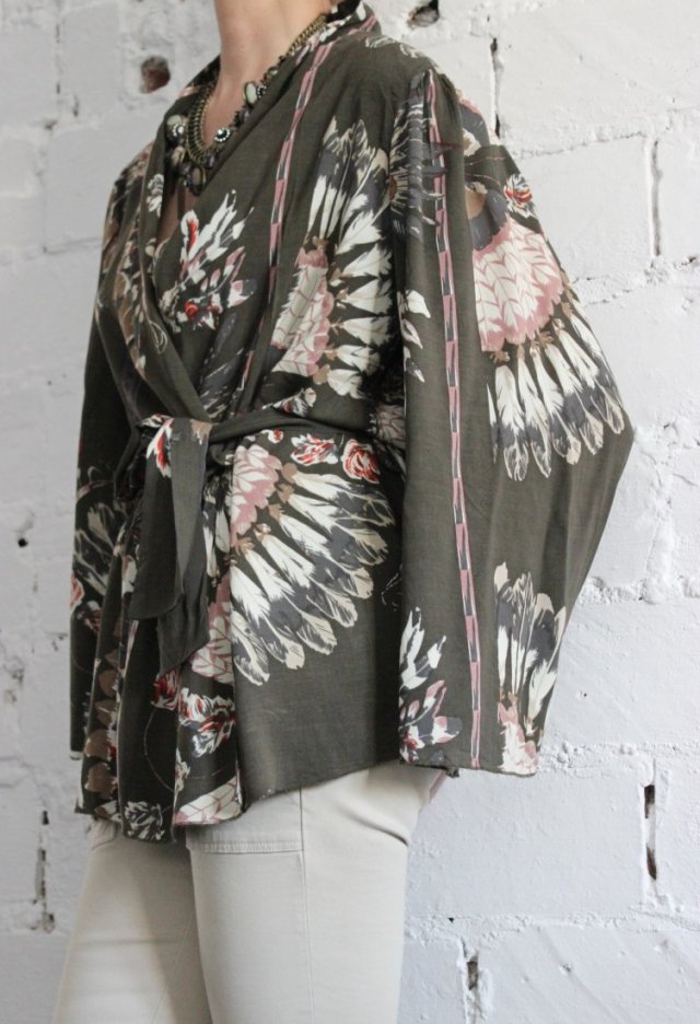 Bluzka kimonowa wiązana w pasie. Firma DIDI. Rozmiar 38/M. Wymiary: obwód biustu-55cm, pas-46cm, długość-74cm, długość rękawa-56cm.
