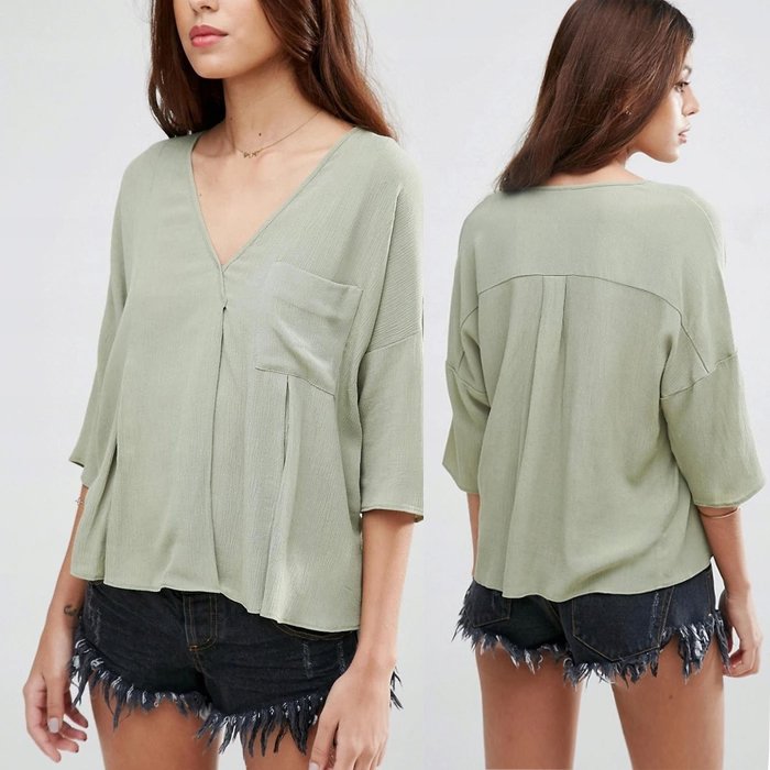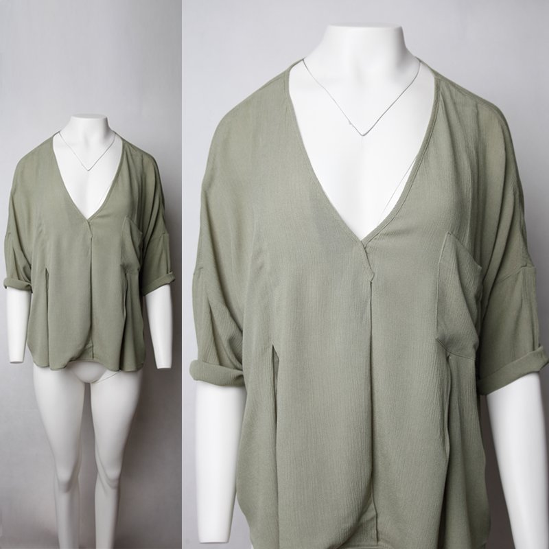 Luźna bluzka o kroju oversizowym, w kolorze jasnej, zgaszonej zieleni khaki. Dekolt V, linia ramion obniżona, z przodu kontrafałdy i zakładki, na piersi kieszonka, z tyłu kontrafałda wykończona karczkiem. Wykonana z komfortowej, przyjaznej ciału tkaniny wiskozowej. Świetny basic do codziennych zestawień.