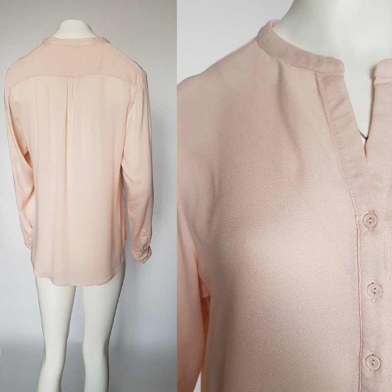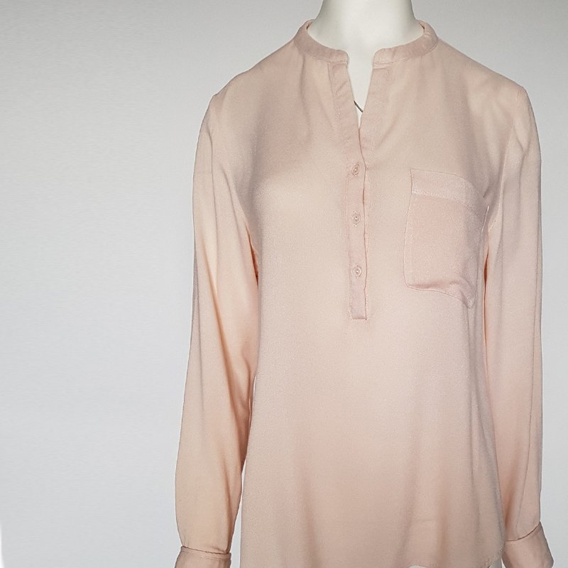 Luźna bluzka koszulowa z bawełnianej krepy w kolorze pastelowego, zgaszonego łososia. Przód do połowy zapinany na guziki, przy szyi wykończona lamówką, na piersi kieszonka, rękawy długie wykończone mankietem. Komfortowy, przewiewny basic na sezon letni.