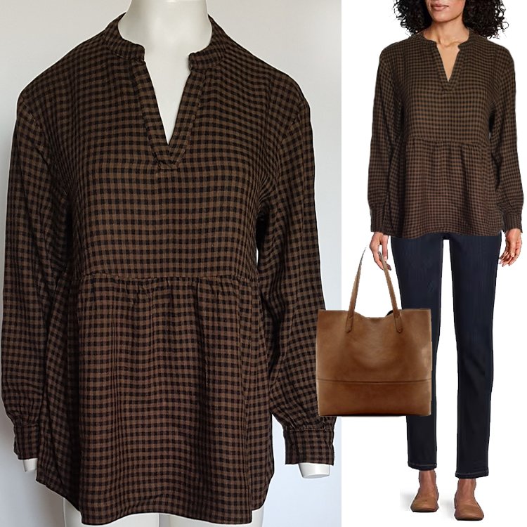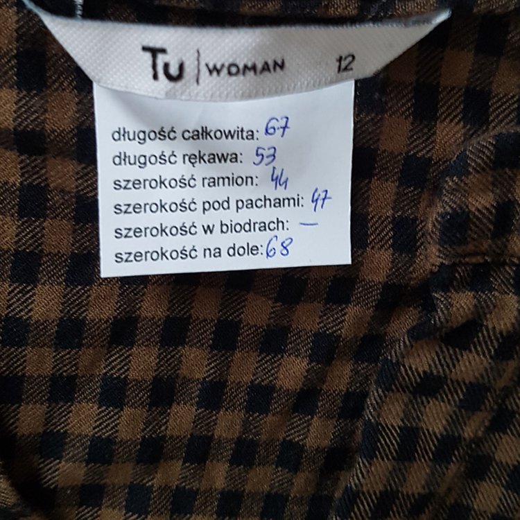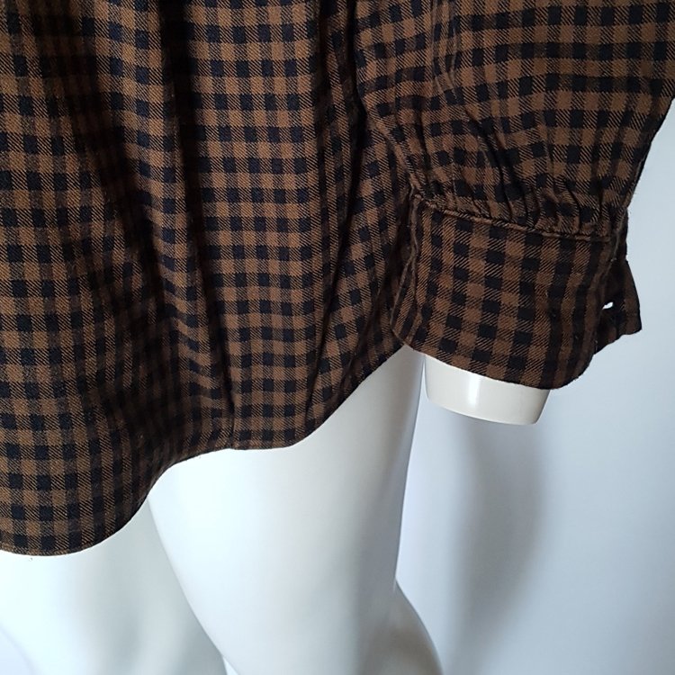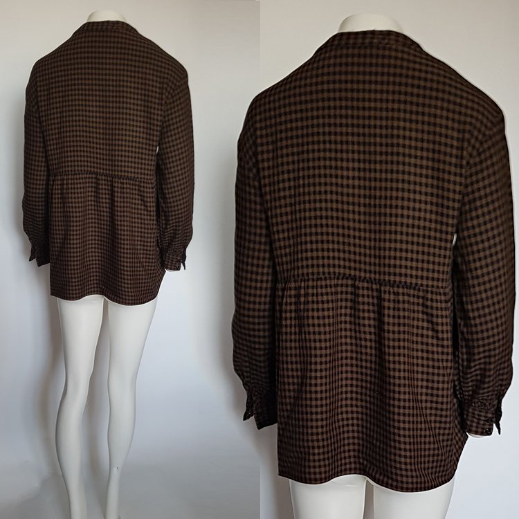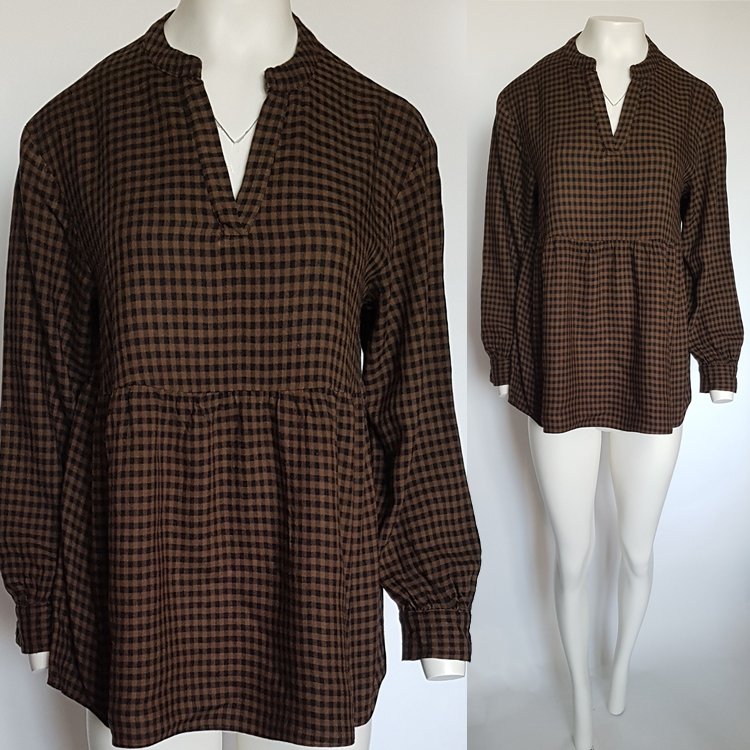 Bluzka koszulowa z falbaną z długimi rękawami zakończonymi mankietem. Dekolt okrągły z rozcięciem, wykończony lamówką. Przyjemna tkanina wiskozowa w brązowo-czarną, drobną kratkę.