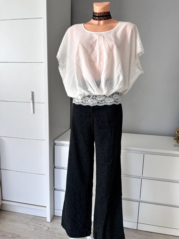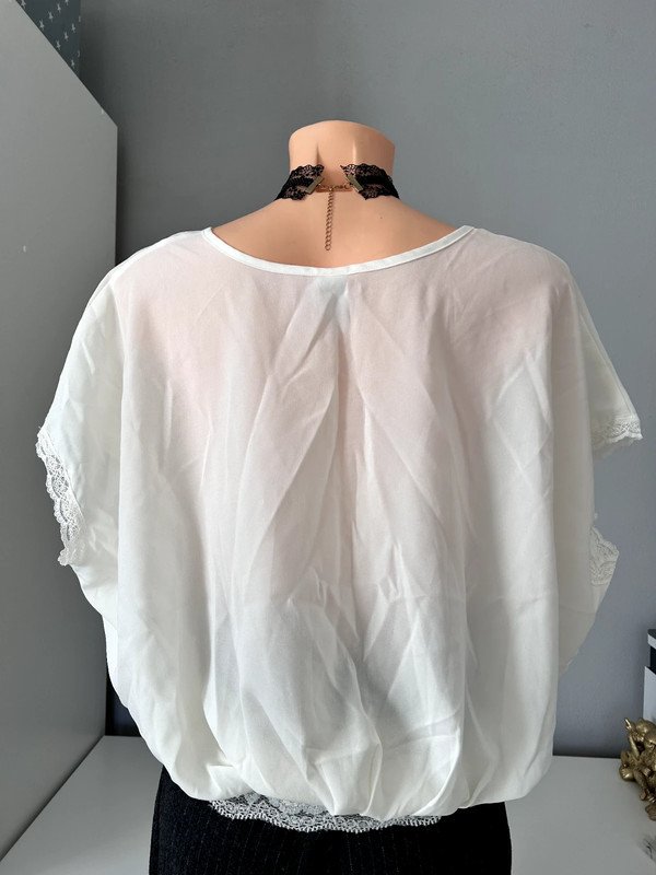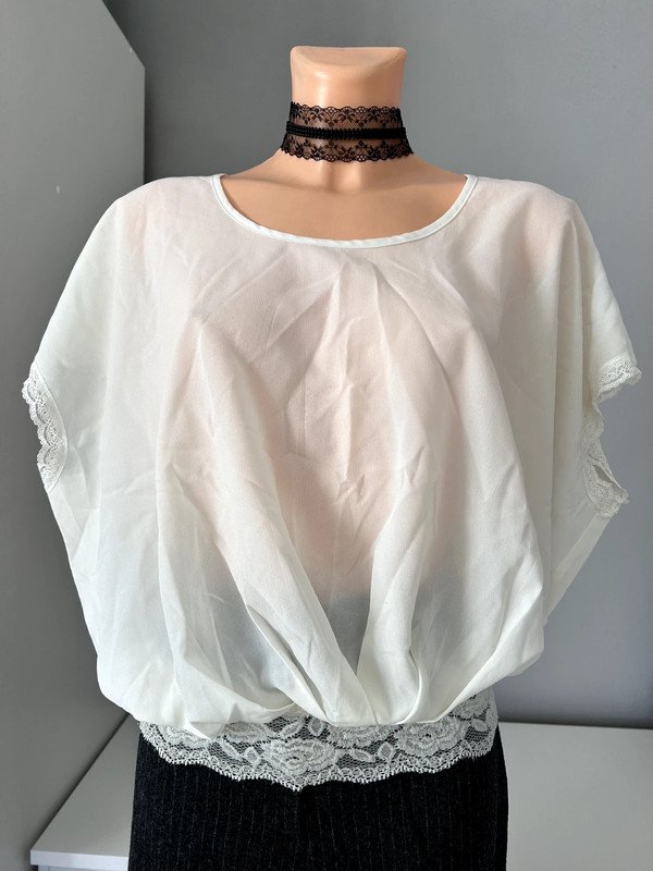 Kremowa cieniutka bluzka Vila z koronką rozmiar M 38. Szeroki oversizowy krój, na dole koronkowy elastyczny ściągacz. Elegancki ponadczasowy krój. Idealna na imprezę jak i do biura. Szafa kapsułowa, old money style. Polecam