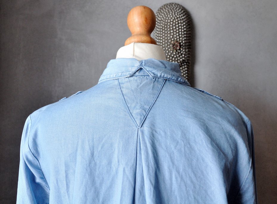 Klasyczny, niewielki kołnierzyk, ciekawie rozdzielony z tyłu. Na plecach plisa, wzmocniona naszytym trójkątem materiału. Tył jest nieco dłuższy od przodu.