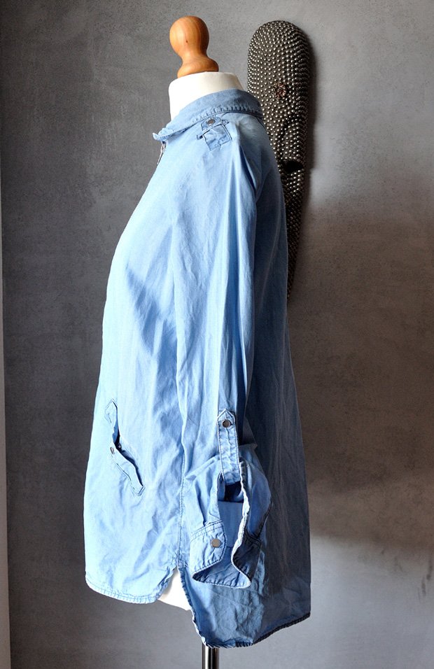 Z cienkiego, błękitnego i denimowo barwionego materiału. Materiał jest przewiewny i przyjemny da skóry.