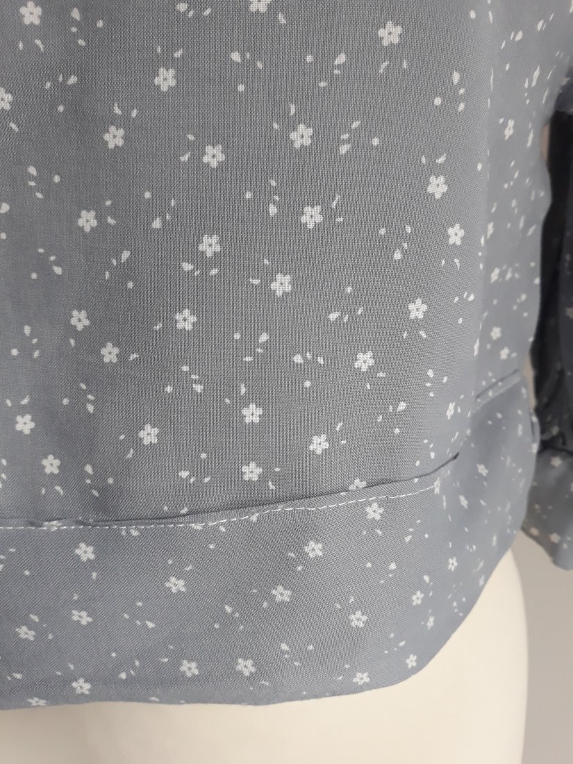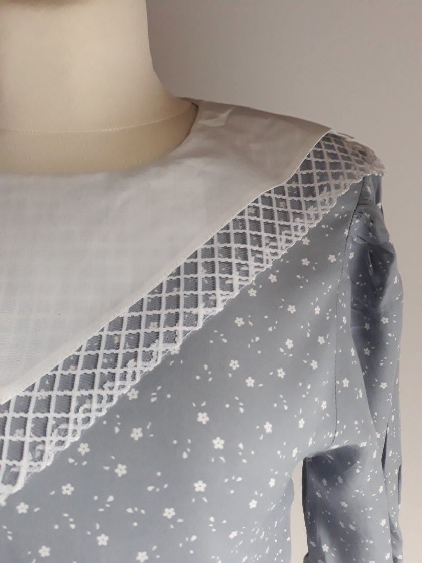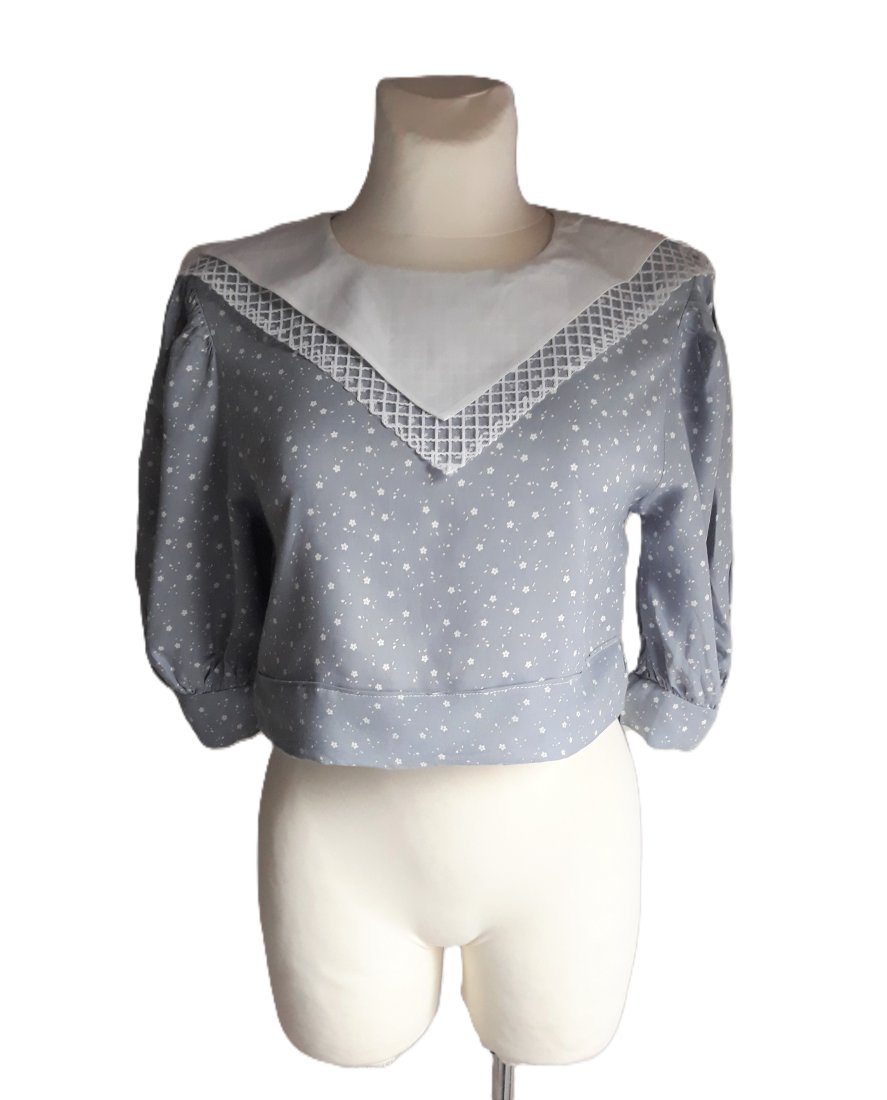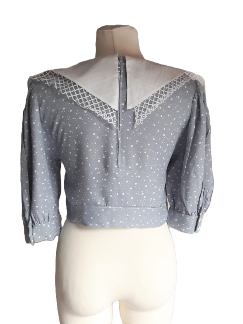 krótka bluzka vintage z lat 90-tych w kolorze jasnoszarym wpadającym lekko w niebieski, w drobny biały kwiatowy wzór, piękny biały podwójny kołnierz w stylu marynarskim, spodni większy kołnierz uszyty został z cienkiej siateczki, szeroki rękawek o długości do łokcia, z marszczeniami i mankietem zapinanym na dwa guziki, z tyłu bluzka zapinana na suwak, wkładana przez głowę, brak metki ze składem materiału