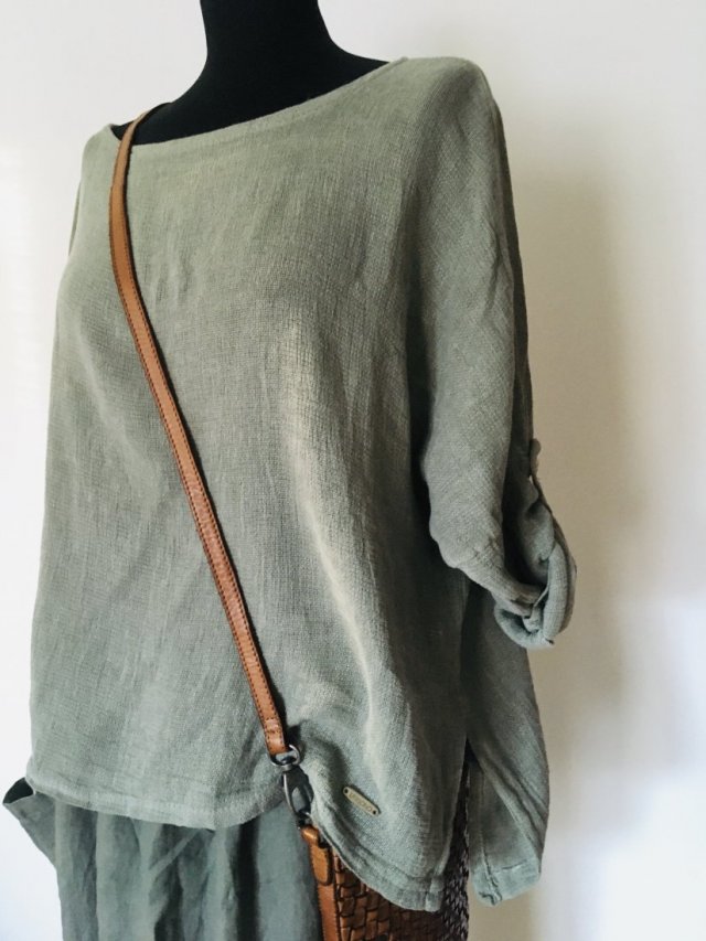 Luźna bluzka len + bawełna. Zwiewna, delikatna. Rozmiar Onesize . Pięknie tworzy luźna kompozycje wraz ze spodniami dostępnymi w galerii . Polecam