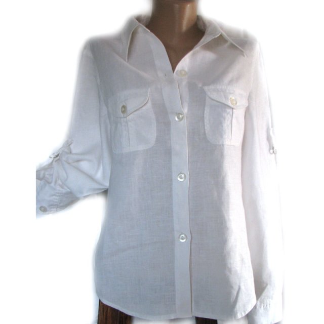 Niezwykle ciekawa bluzka z lnu, zapinana z przodu na guziczki. Na biuście 2 kieszonki, z ozdobnym stębnowaniem, zapinane na guziczki. Dół zaokrąglony. Rękaw długi, zakończony mankietem, z regulacją długości. Długości rękawa mierzona po wewnętrznej stronie 49 cm. Bluzka idealna do leginsów lub jeansów rurek. Wymiary na płasko: biust 48 cm, talia 48 cm, biodra 53 cm.