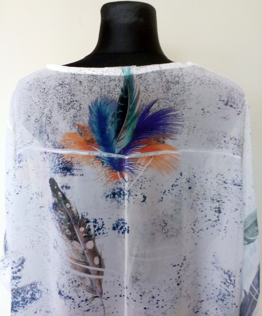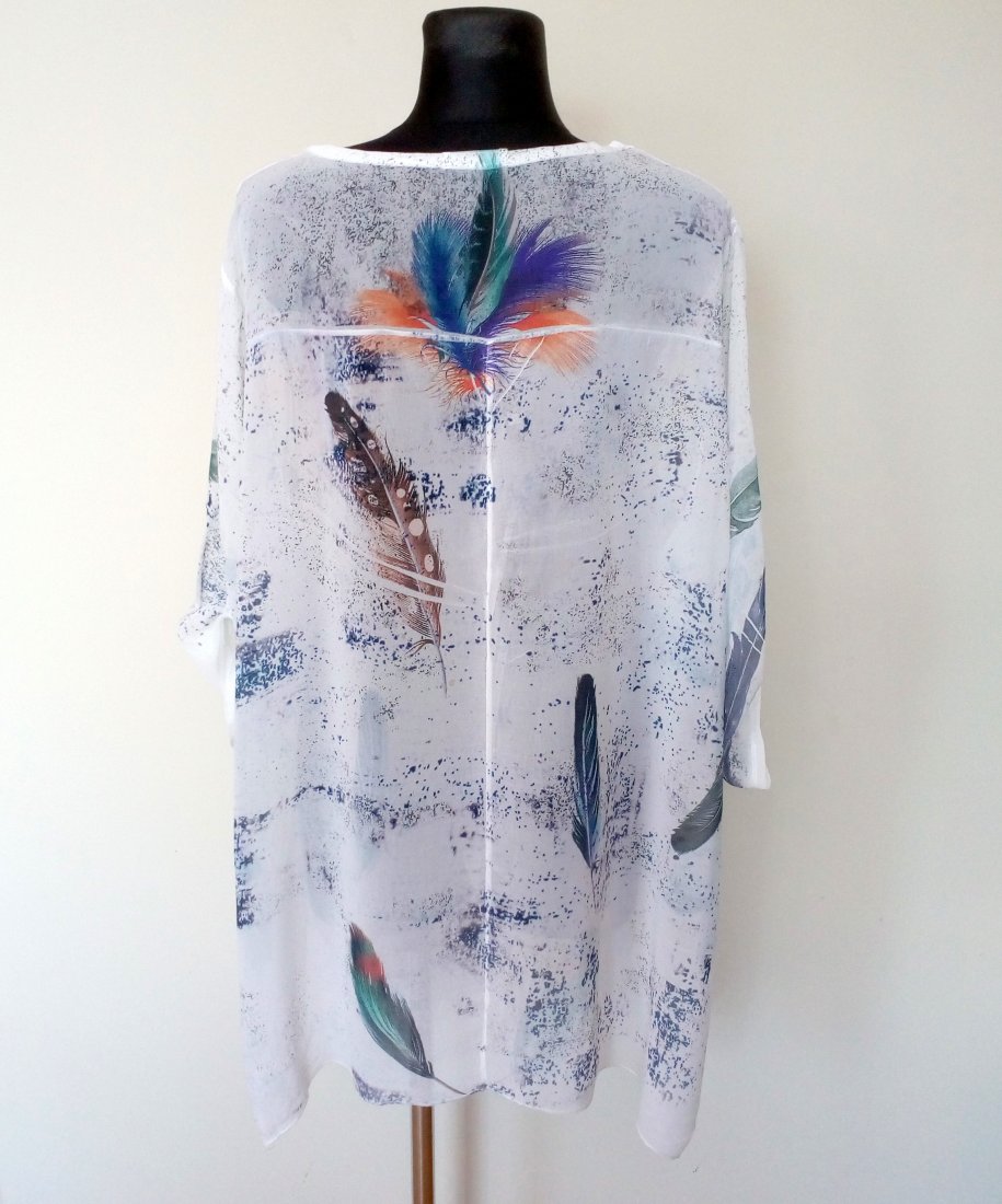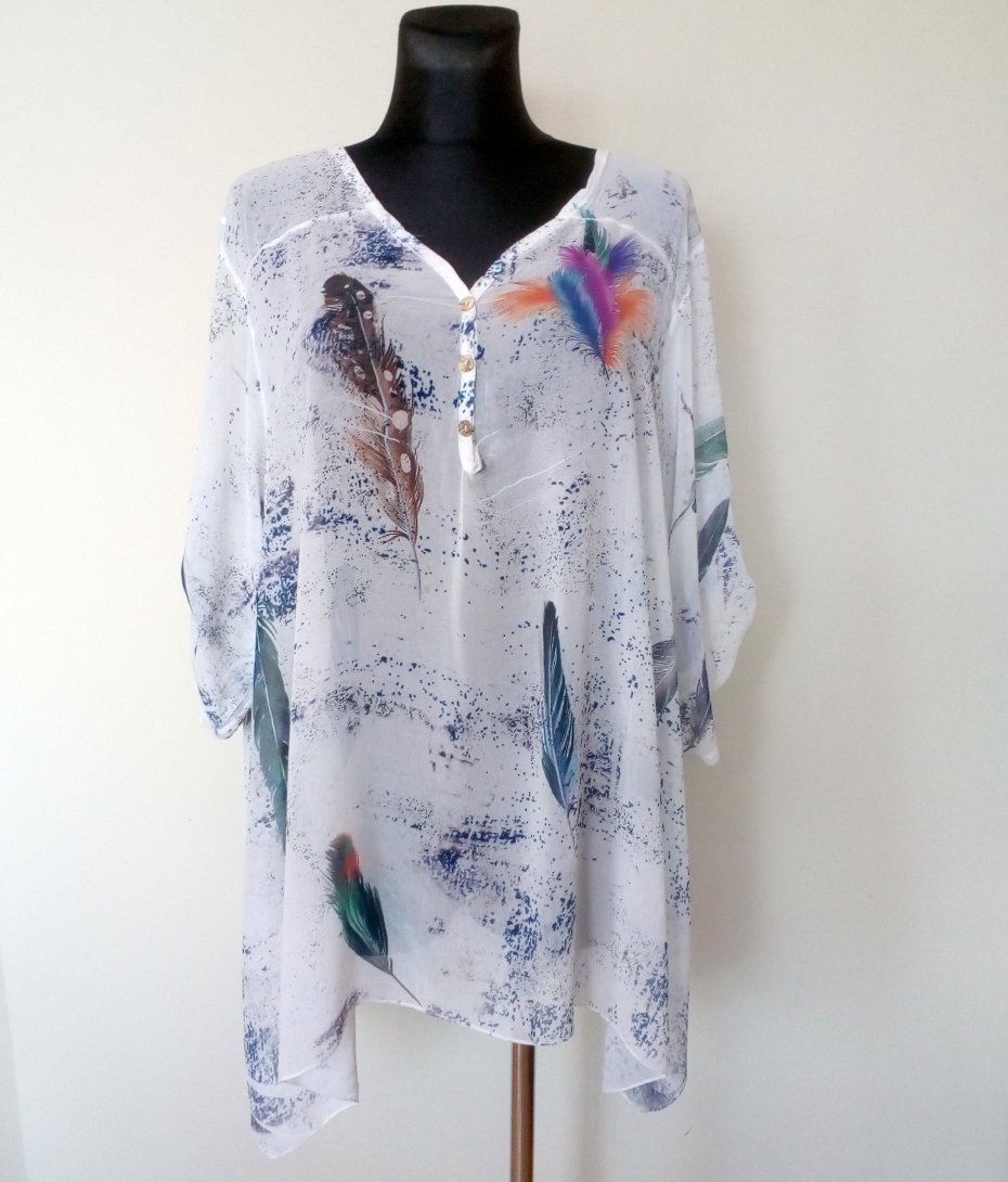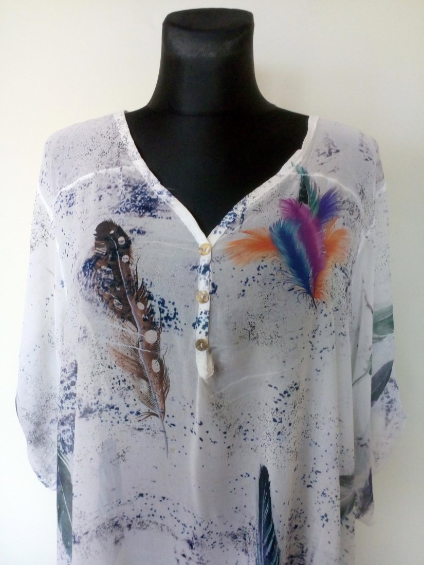 Zwiewna, oversizowa bluzka z delikatnego polyestru, asymetryczna - dłuższe boki, od dekoltu zapięcie na trzy guziczki, rękaw 3/4 podpinany paskiem, na plecach karczek, rozcinana u dołu po bokach