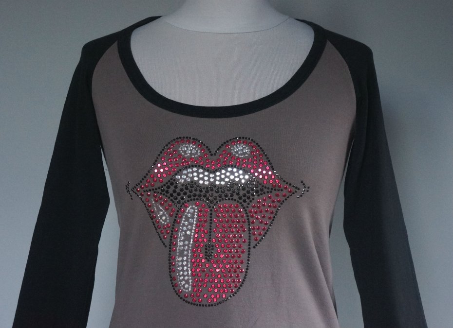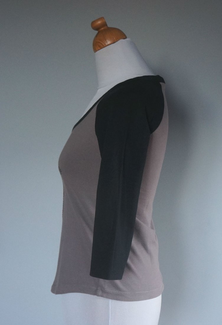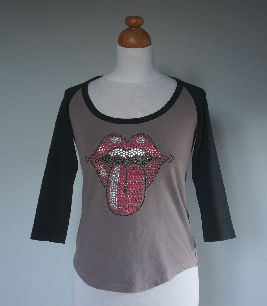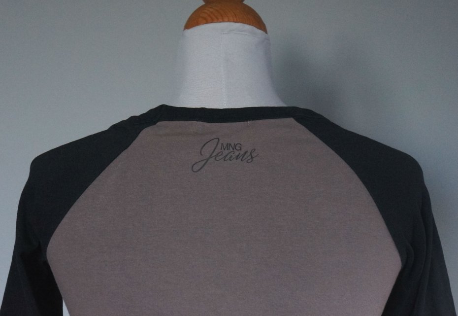 Bluzka MNG z owalnym dekoltem. Z przodu aplikacja z jetów. Rękaw ¾. Stan bardzo dobry.