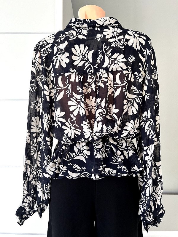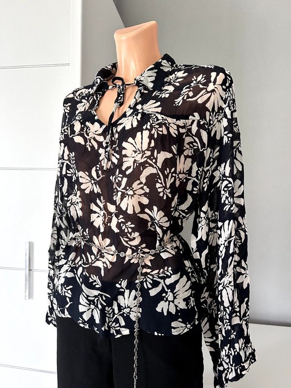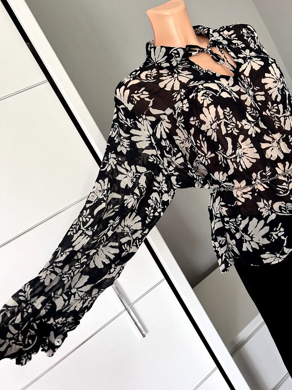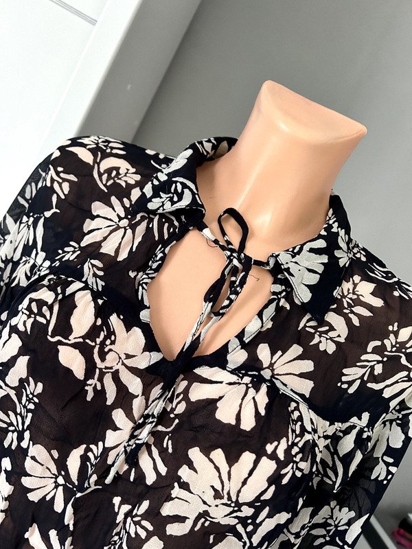 Bluzka firmy Part Two, rozmiar 38 M, 100 % wiskoza, a więc przewiewna. Cieniutka, dekolt v, kołnierzyk, wiązana przy dekolcie. Szerokie balonowe rękawy z mankietem zapinanym na guzik I ozdobionym falbanką. Czarna w kwiatowy beżowy print. Pasek nie jest w komplecie