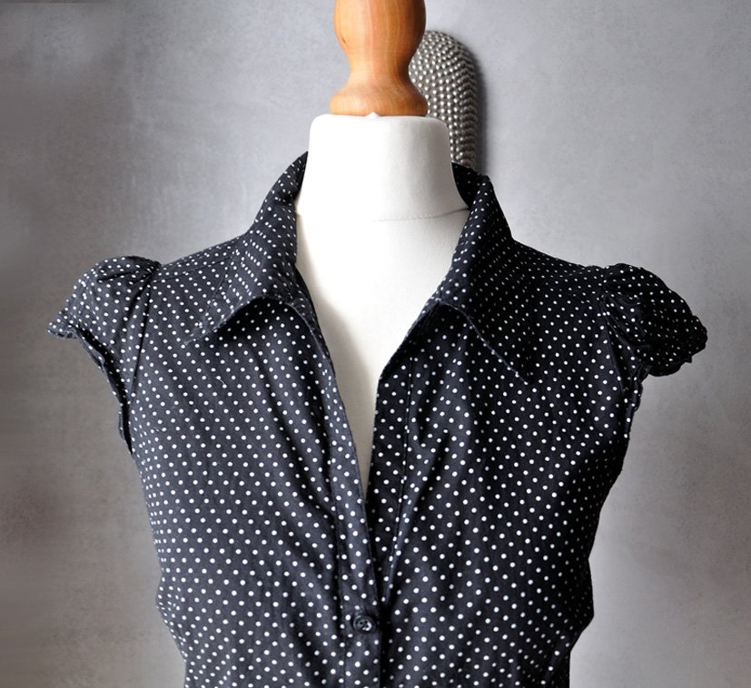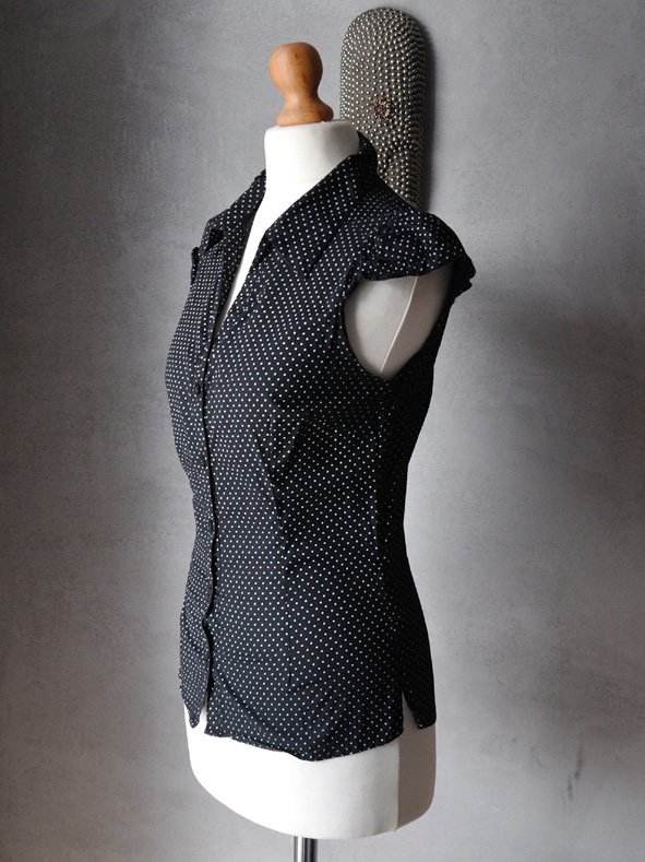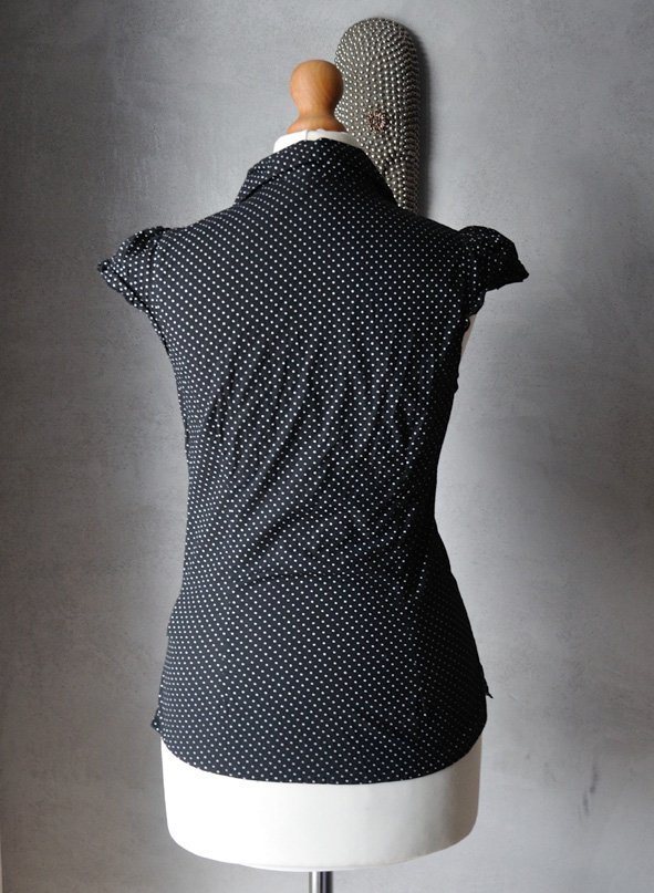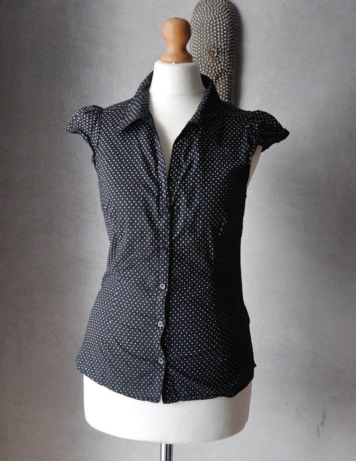 Zapinana na guziki (kończą się powyżej biustu, ma więc spory dekolt). Z kołnierzykiem i mikro rękawkami - bufkami. Na dole, na bocznych szwach rozporki. Spód lekko zaokrąglony do dołu.
