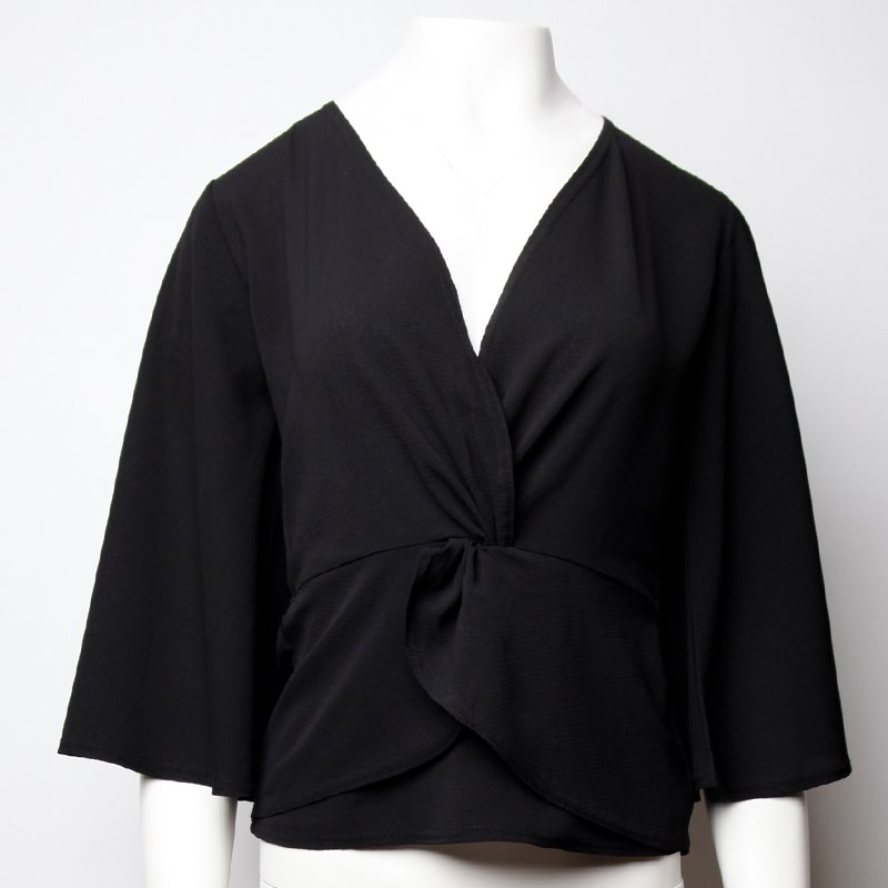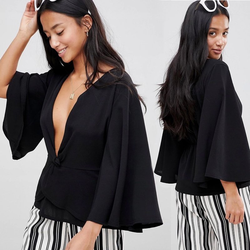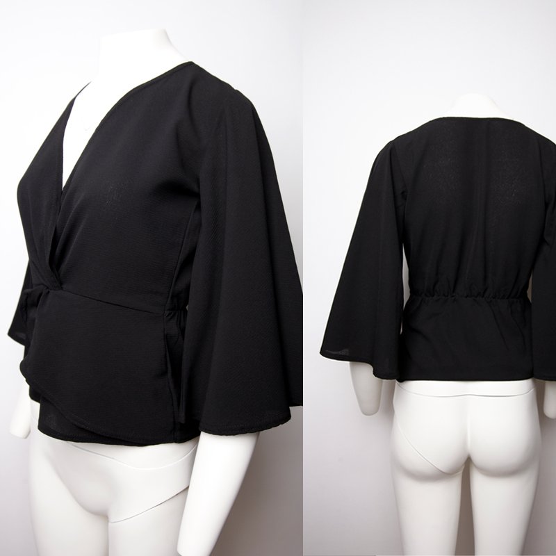 Bluzka z głębokim dekoltem (regulowany zapięciem na haftkę, można zmniejszyć) rękawy luźne w formie modnych dzwonów, przełożenie przodu tworzy ozdobne wiązanie. Pas dopasowany, zbierany wszytą z tyłu gumką. Kobiecy fason, idealny na co dzień, jak i do eleganckich zestawień.