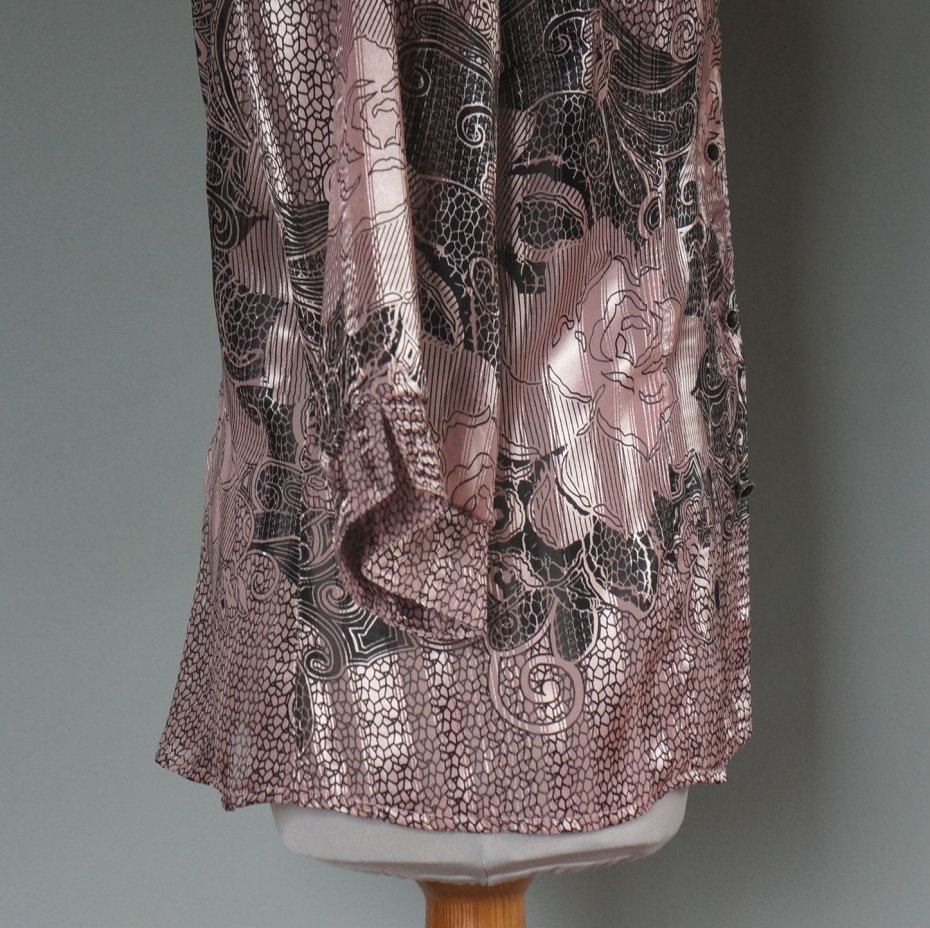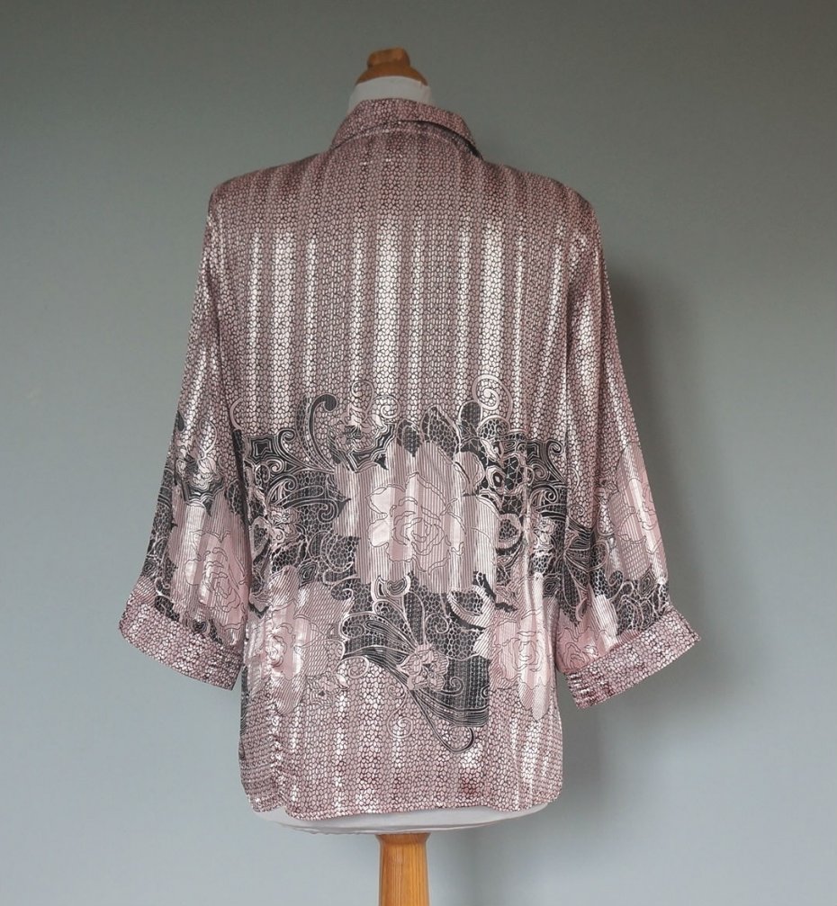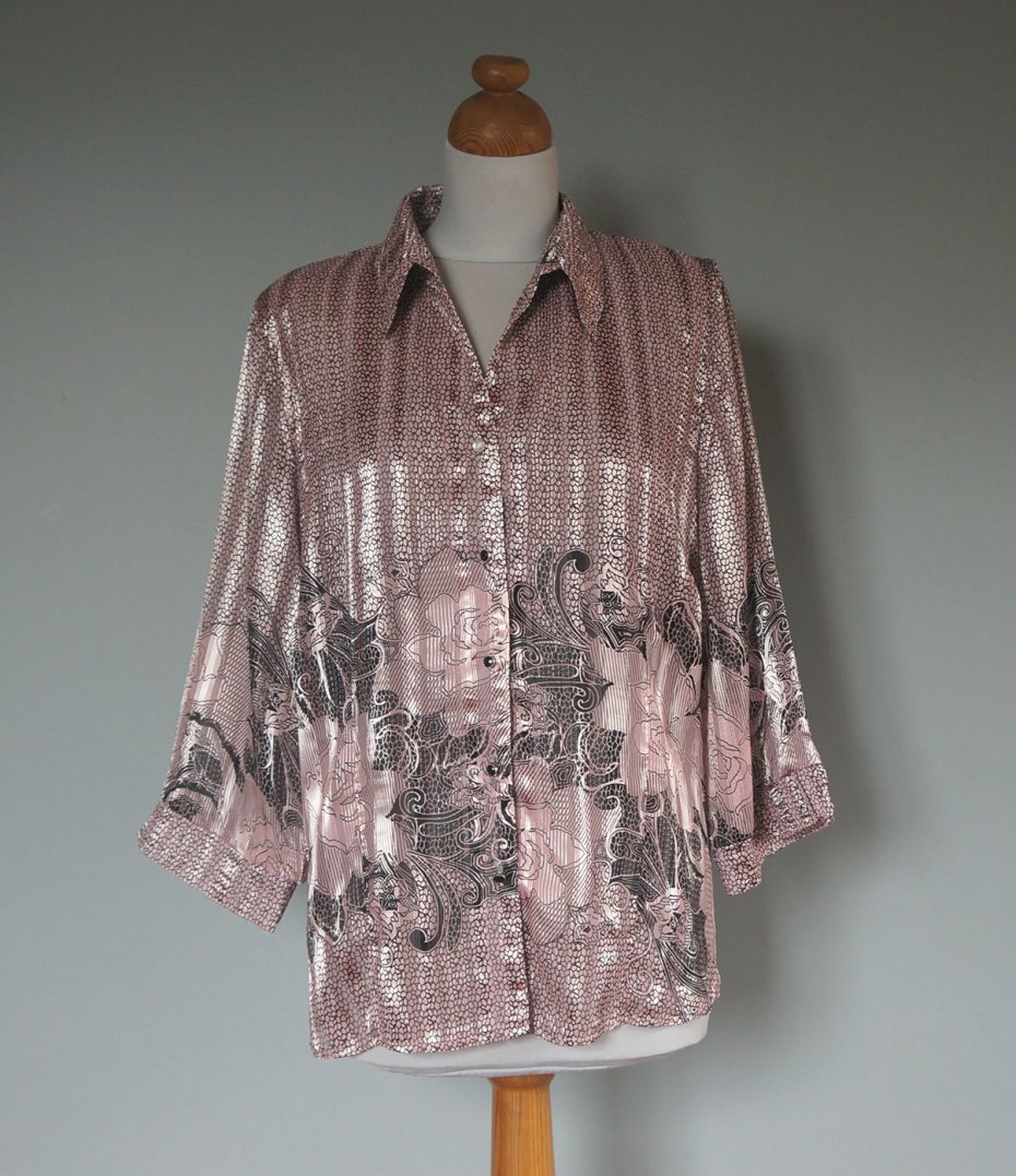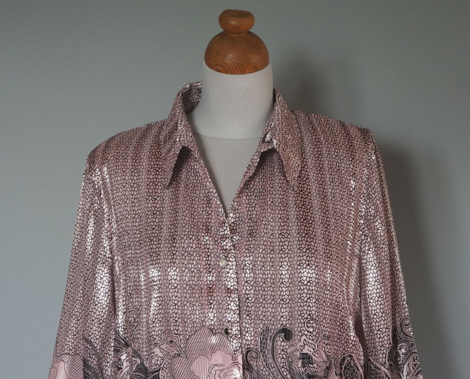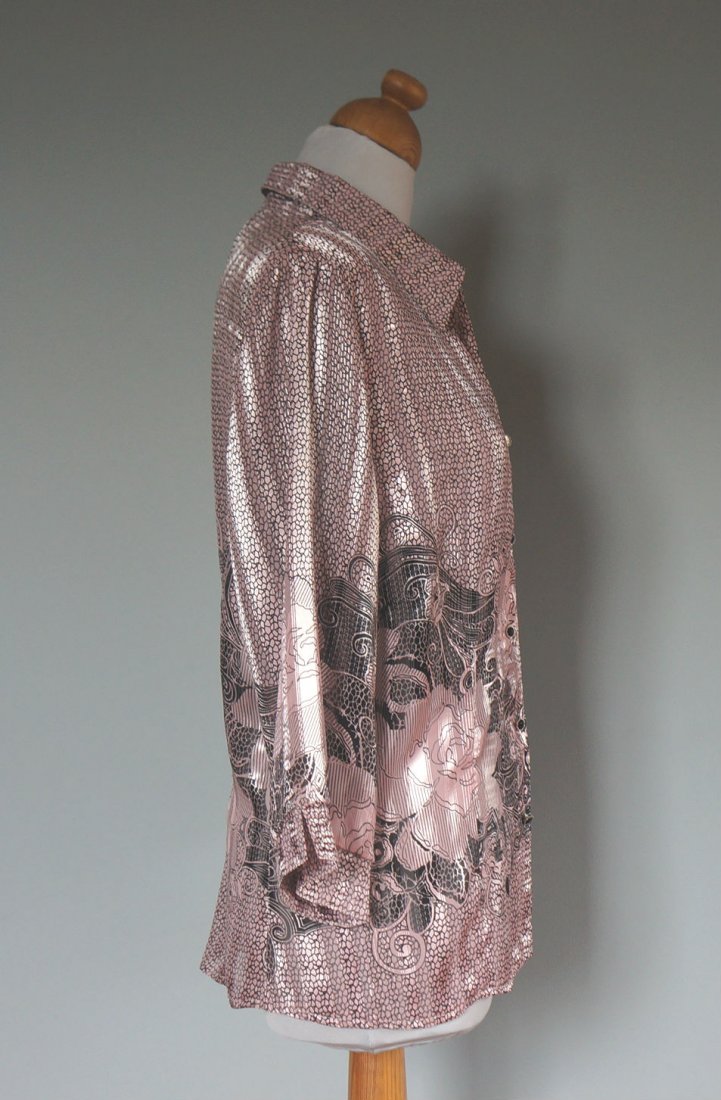 Damska bluzka zapinana na guziki. Rękaw ¾. Na ramionach delikatne poduszki - można je odpruć. Tkanina - 100 % wiskoza. Stan dobry.