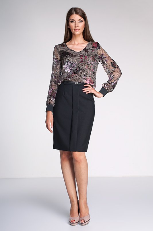 Bluzka uszyta z jedwabiu z welurowym wzorem, na podszewce z dzianinowej siateczki. Rękawy wykończone mankietami z czarnej szerokiej gumy, zalotny dekolt.