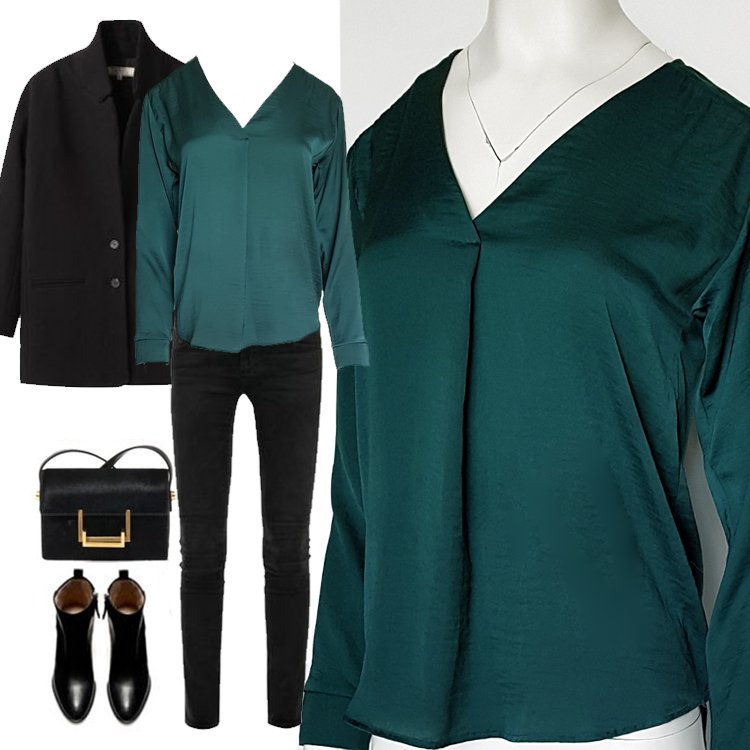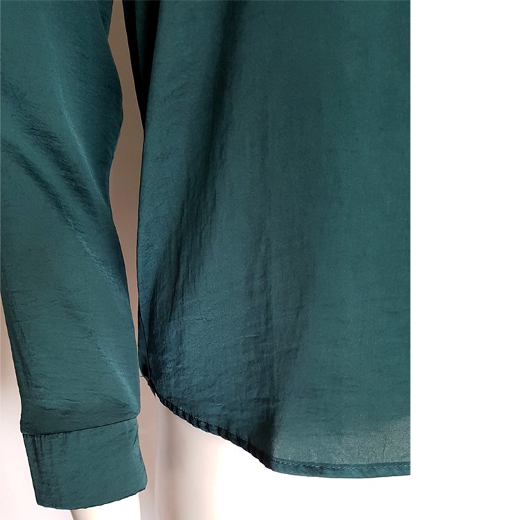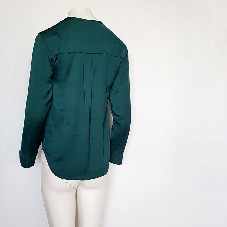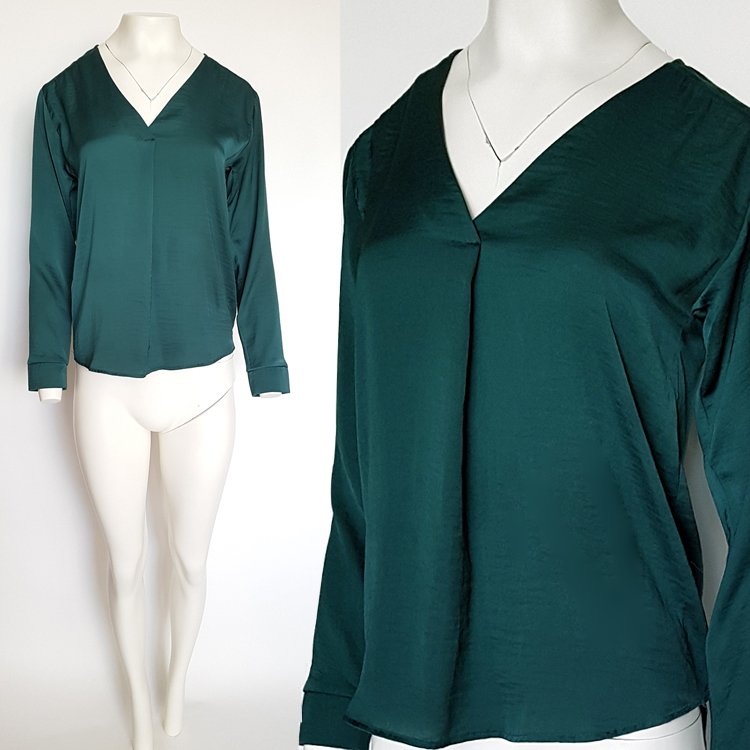Lekka bluzka z długimi rękawami. Dekolt w szpic z zakładką. Materiał śliski o jedwabnym połysku. Klasyczna propozycja zarówno do zestawień casualowych jak i eleganckich.