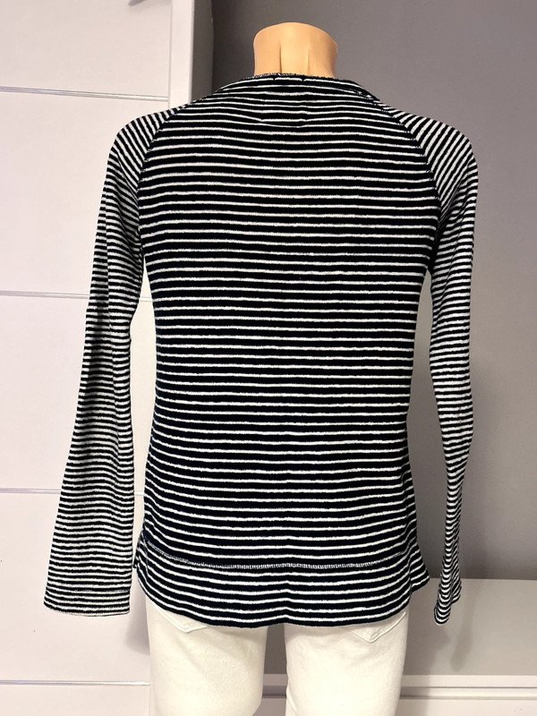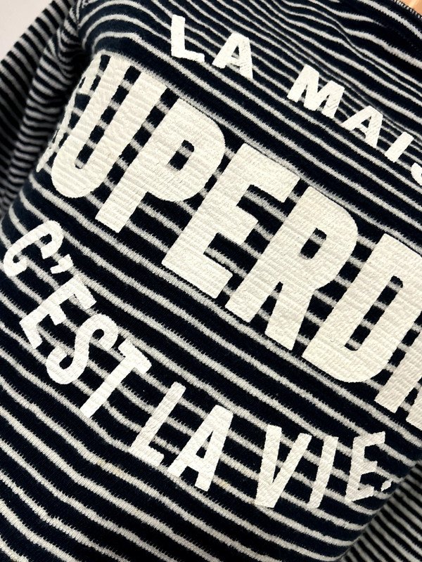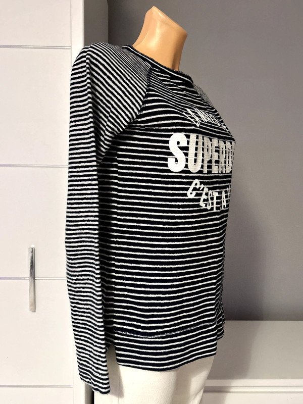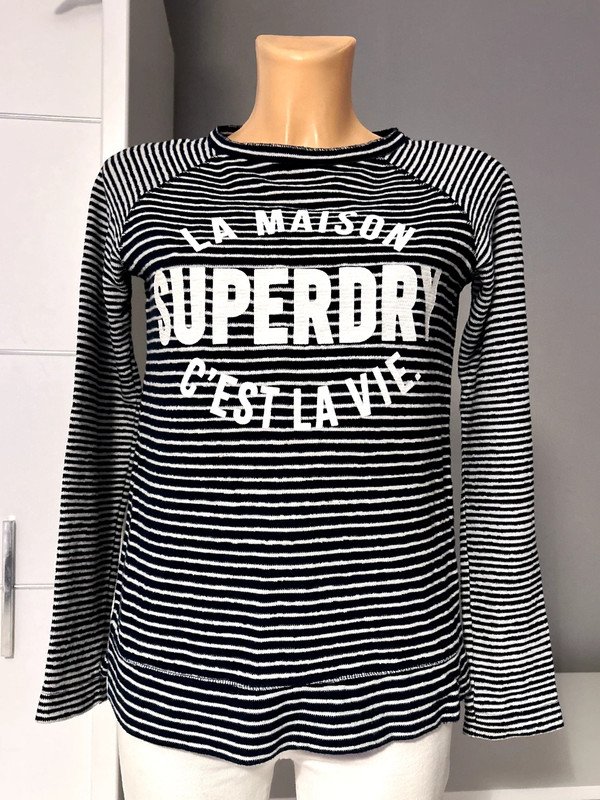 Bluzka firmy Superdry, rozmiar XXS 32. W paseczki białe i granatowe, wygodna, sportowa, mocno elastyczna. Wykonana z bawełny 100 %.