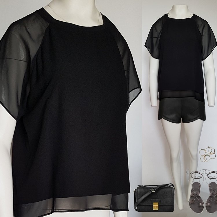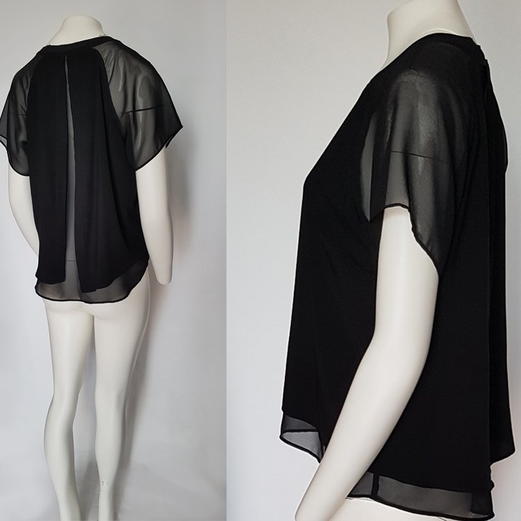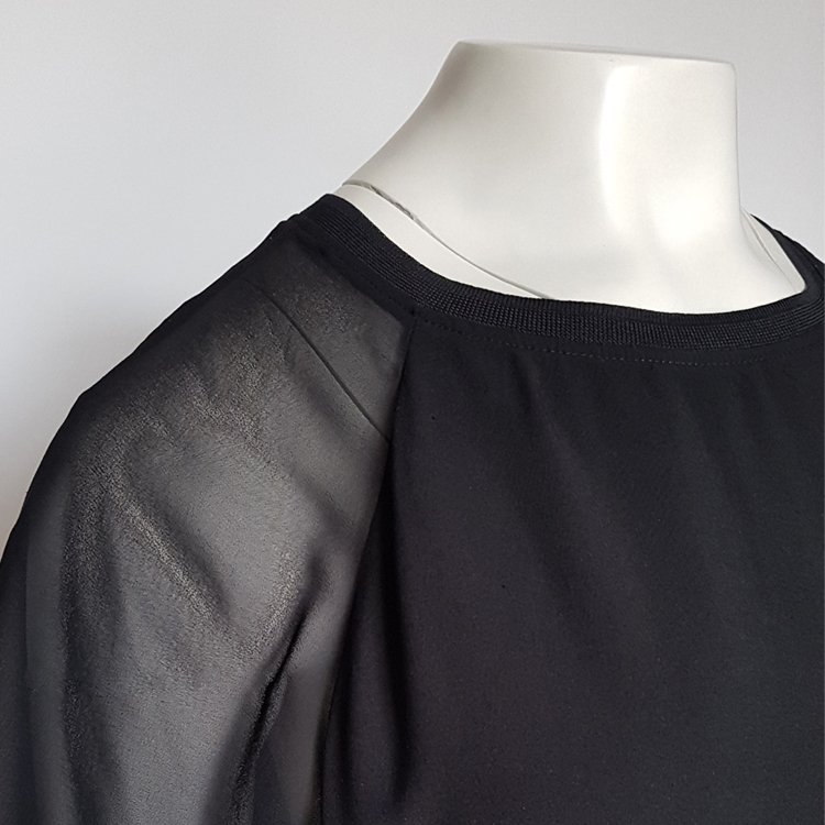 Bluzka łączona, korpus z matowej wiskozy z rozcięciem na plecach, rękawy i spód z szyfonu. Dekolt okrągły zebrany dzianinowym ściągaczem. Przyjemna lekka, zwiewna propozycja na lato.