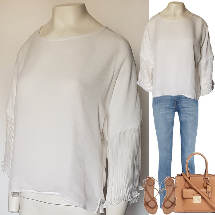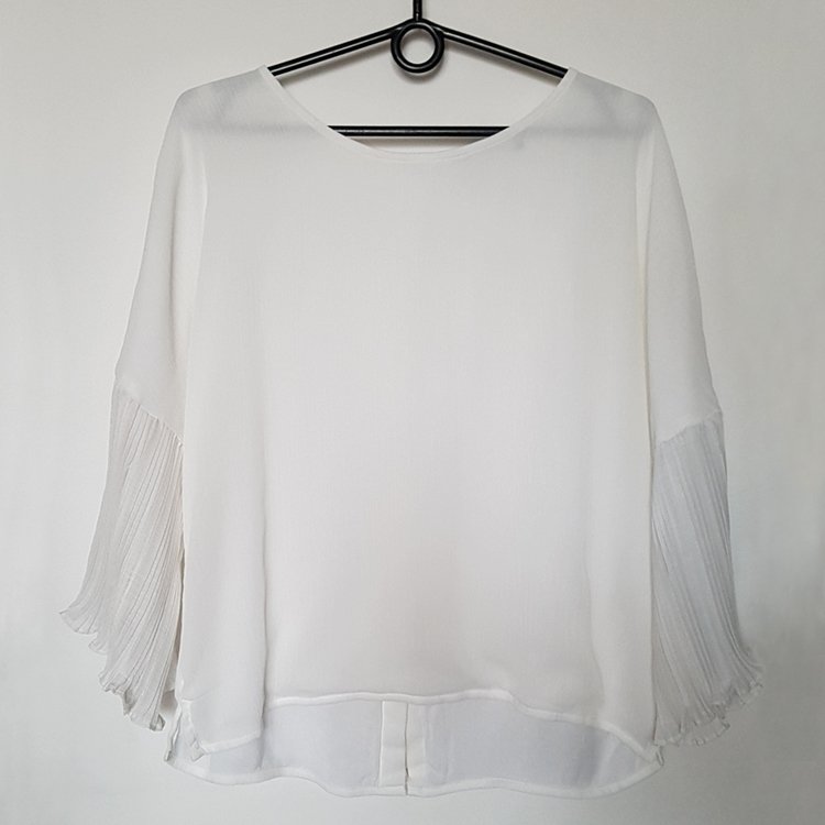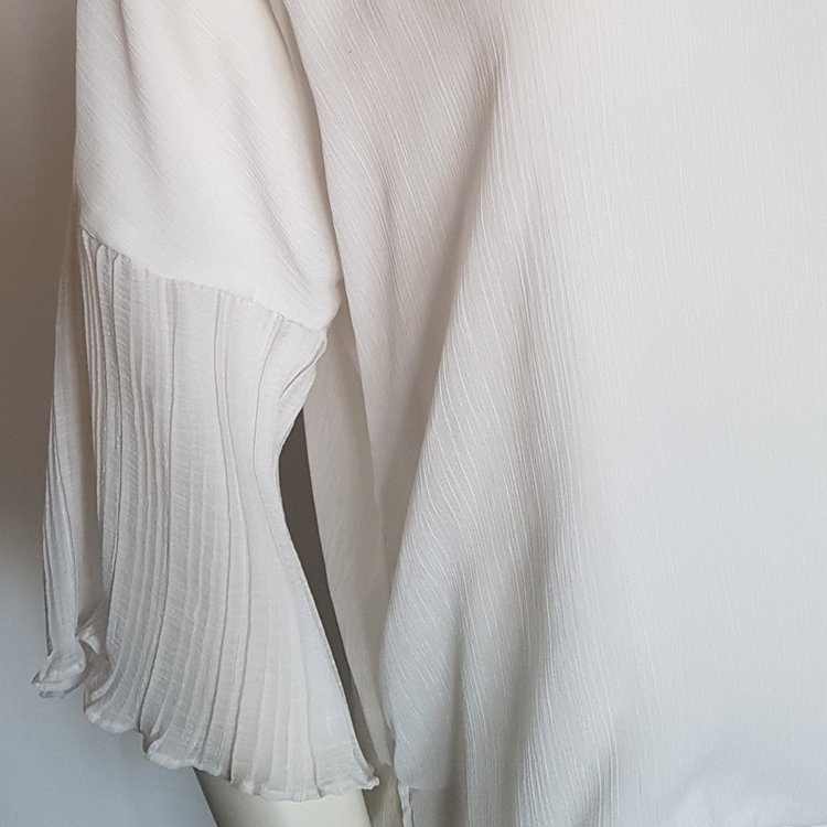 Bluzka szyfonowa na podszewce, dekolt okrągły, rękawy o obniżonej linii w formie plisowanej falbany. Zapinana z tyłu na guziki kryte listewką.