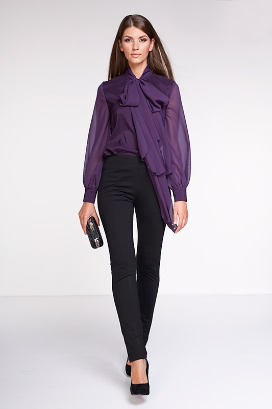 Bluzka uszyta z cienkiej tkaniny satynowej od środka i szyfonu w kolorze fioletowym. Rękawy obszerne, udrapowane przy mankietach. Bardzo długa wstęga do zawiązania na kokardę. Ponadto pod nią są dodatkowe szarfy przypominające żabot.