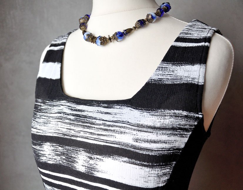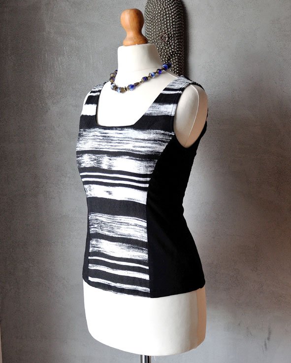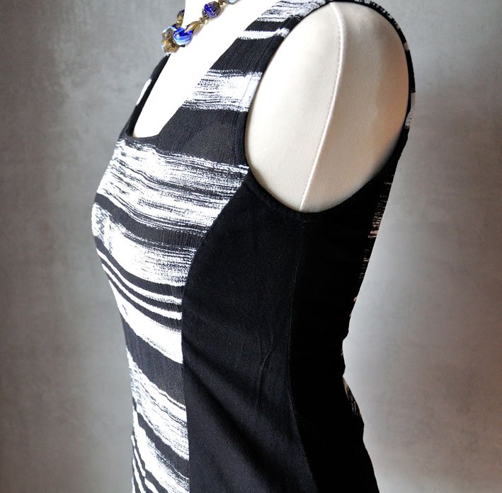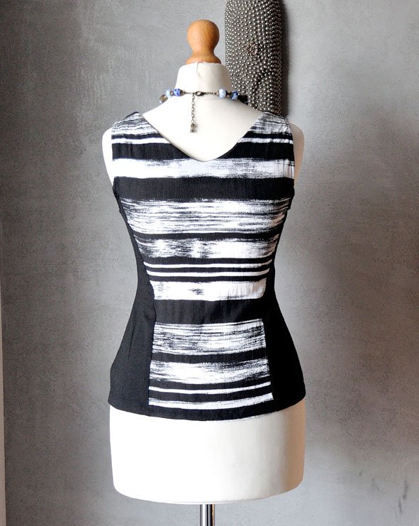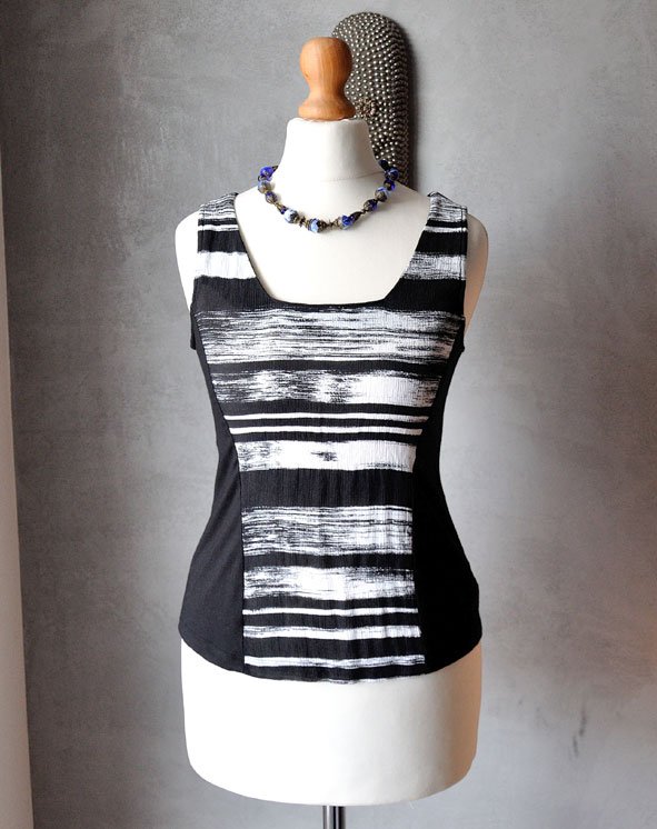Uszyta z łączonych materiałów przód o tył z cieńszego, marszczonego szyfonu w czarno - białe mazaje; po bokach wszyte pasy z dzianiny wiskozowej w kolorze czarnym. Na przedzie pięknie wykrojony, prawie kwadratowy dekolt; z tyłu trójkątny.