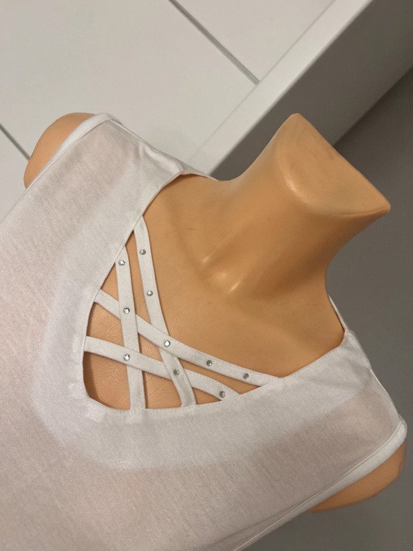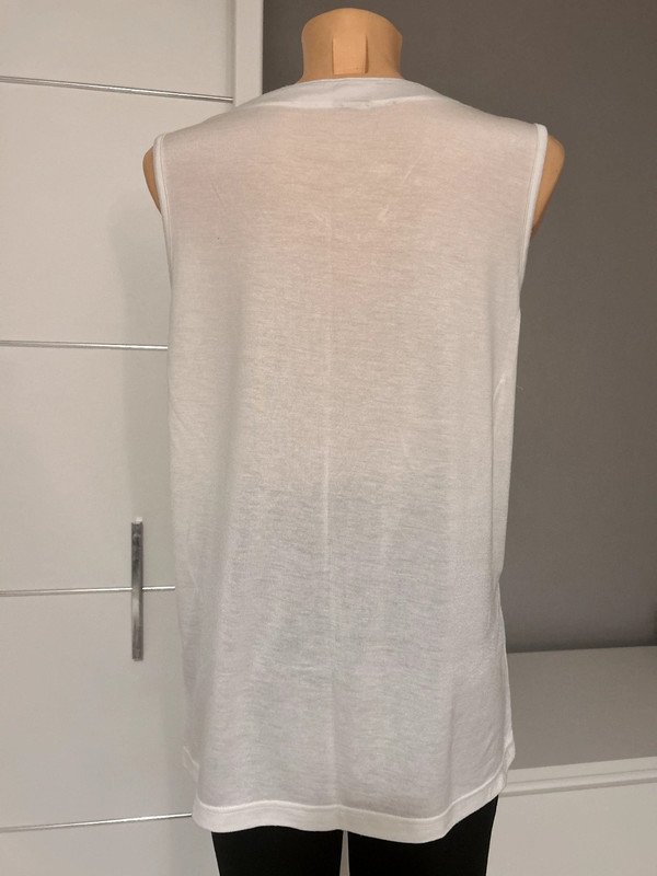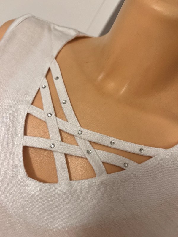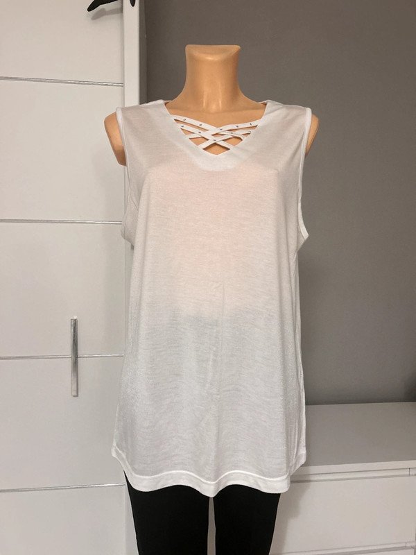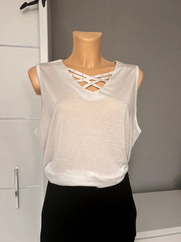 Bluzka, tunika biała, bez rękawów, rozmiar określam na L 40. Dekolt V ozdobiony skrzyżowanymi paseczkami ze strasikami.