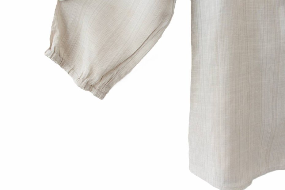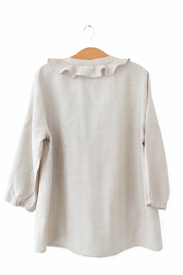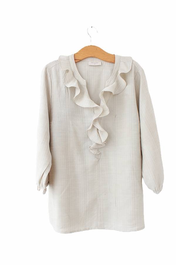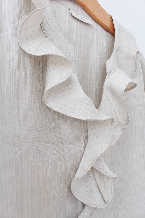 Bluzka vintage z piękną falbaną na dekolcie, wykonana z przewiewnej tkaniny w delikatny prążek.