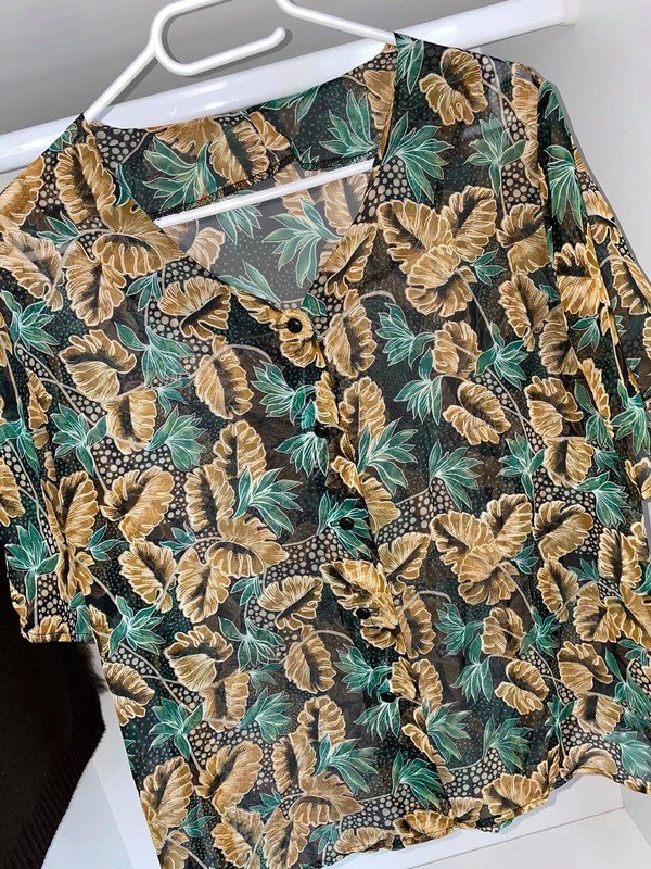 Bluzka mgiełka Vintage w liście z guzikami w modny teraz print w liście.