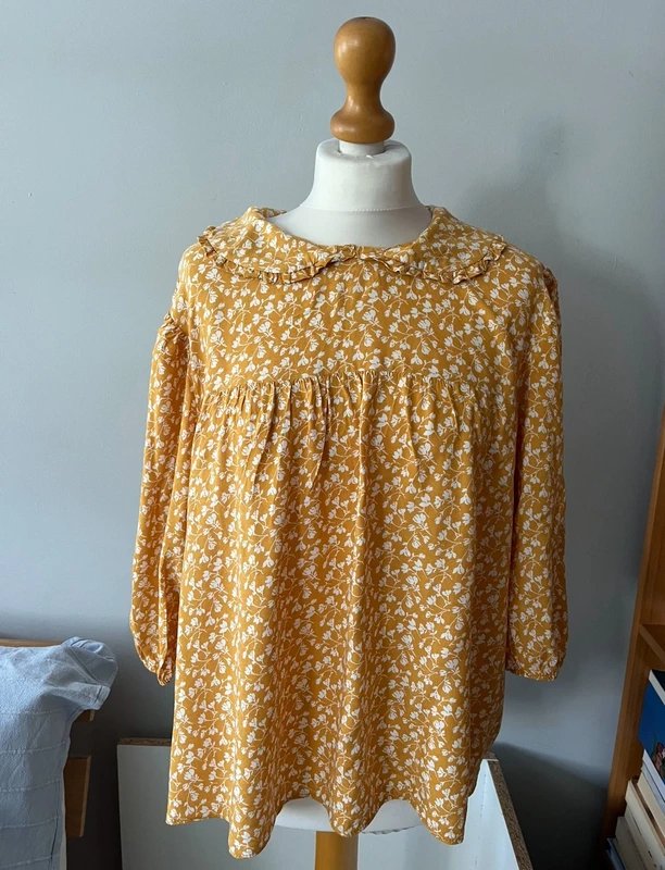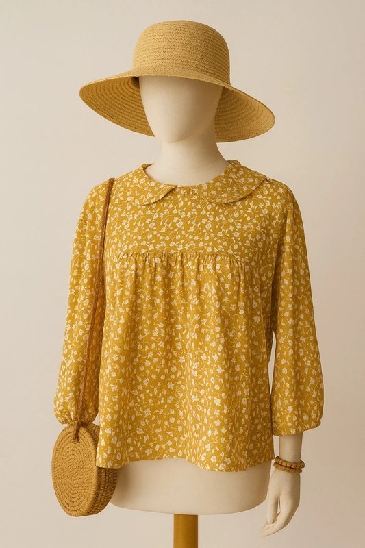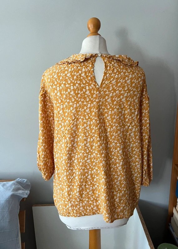 Bluzka vintage w kolorze musztardowej żółci, ozdobiona drobnym, białym motywem kwiatowym. Delikatnie rozkloszowany fason z karczkiem i marszczeniem podkreśla lekkość i romantyczny charakter bluzki.