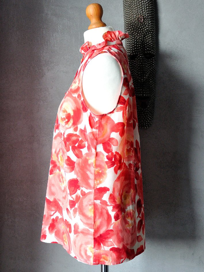 Uszyta z szyfonowej tkaniny w piękny, kwiatowy wzór (odcienie różu wpadające w czerwień i koralowy, na beżowym tle).