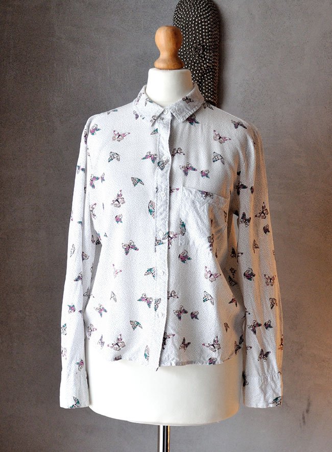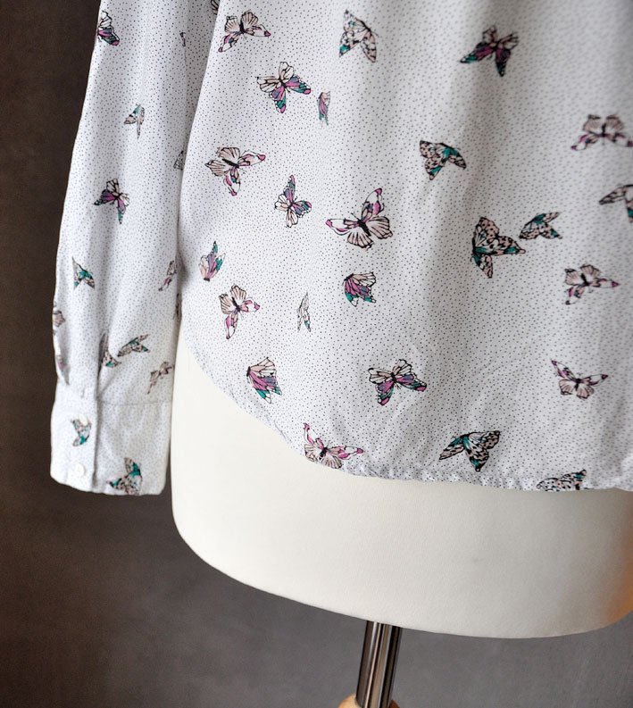 Uszyta z białej, miękkiej, przyjemnej tkaniny wiskozowej w print: czarne kropeczki oraz motyle w odcieniach różu i turkusu.