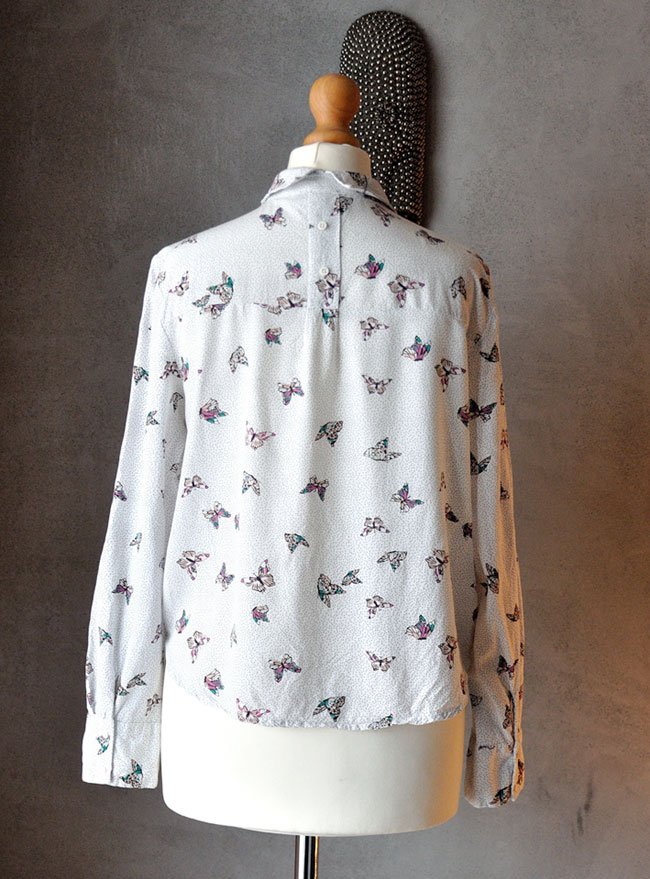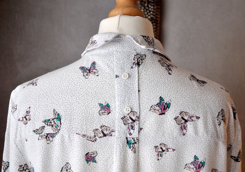 Z tyłu kołnierzyk rozdzielony, dodatkowo wszyto ozdobnie krótką listwę z guziczkami - taki fikuśny twist.