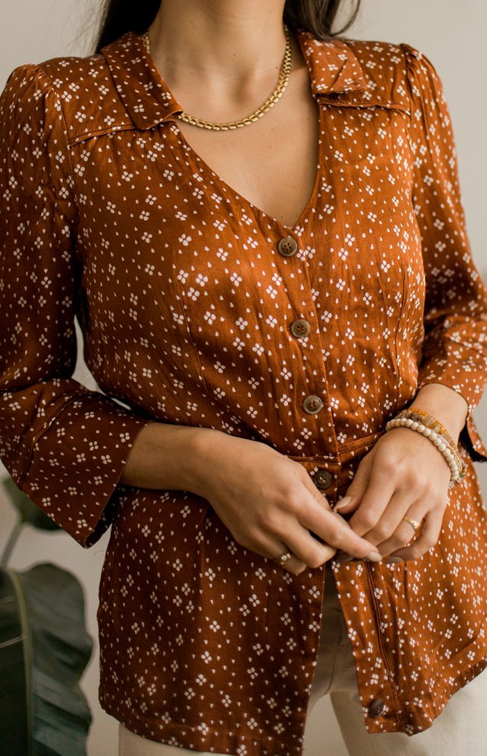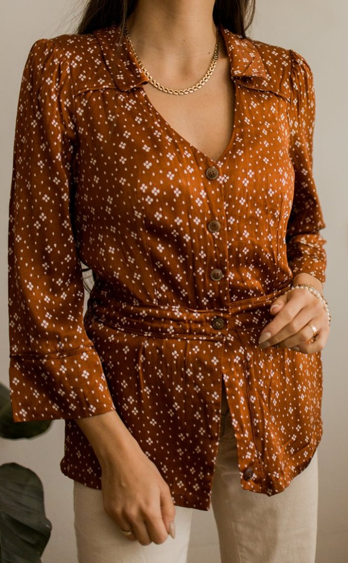 Karmelowa bluzka we wzorek. Została przez kogoś przerobiona, ale wykonanie jest staranne.