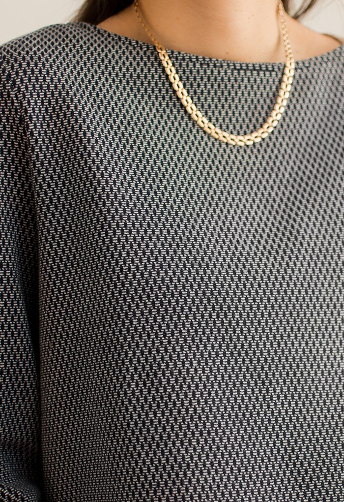Granatowa bluzka we wzorek, grubszy materiał.