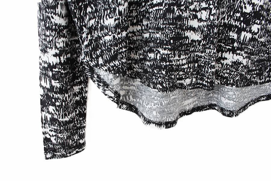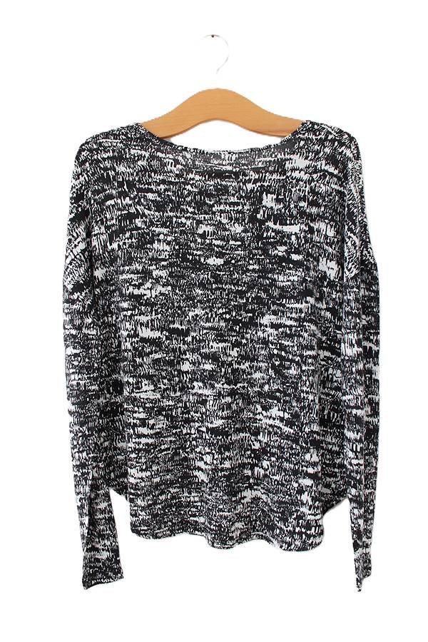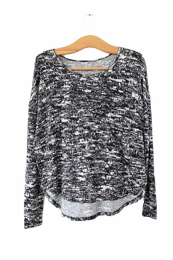 Czarno-biała bluzka vintage z długim rękawem, wykonana z wiskozowej dzianiny.