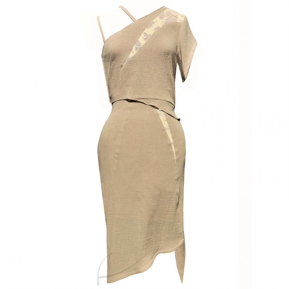 Projekt: top o kroju asymetrycznym, z rękawkiem i na podwójnym połączonym ramiączku.