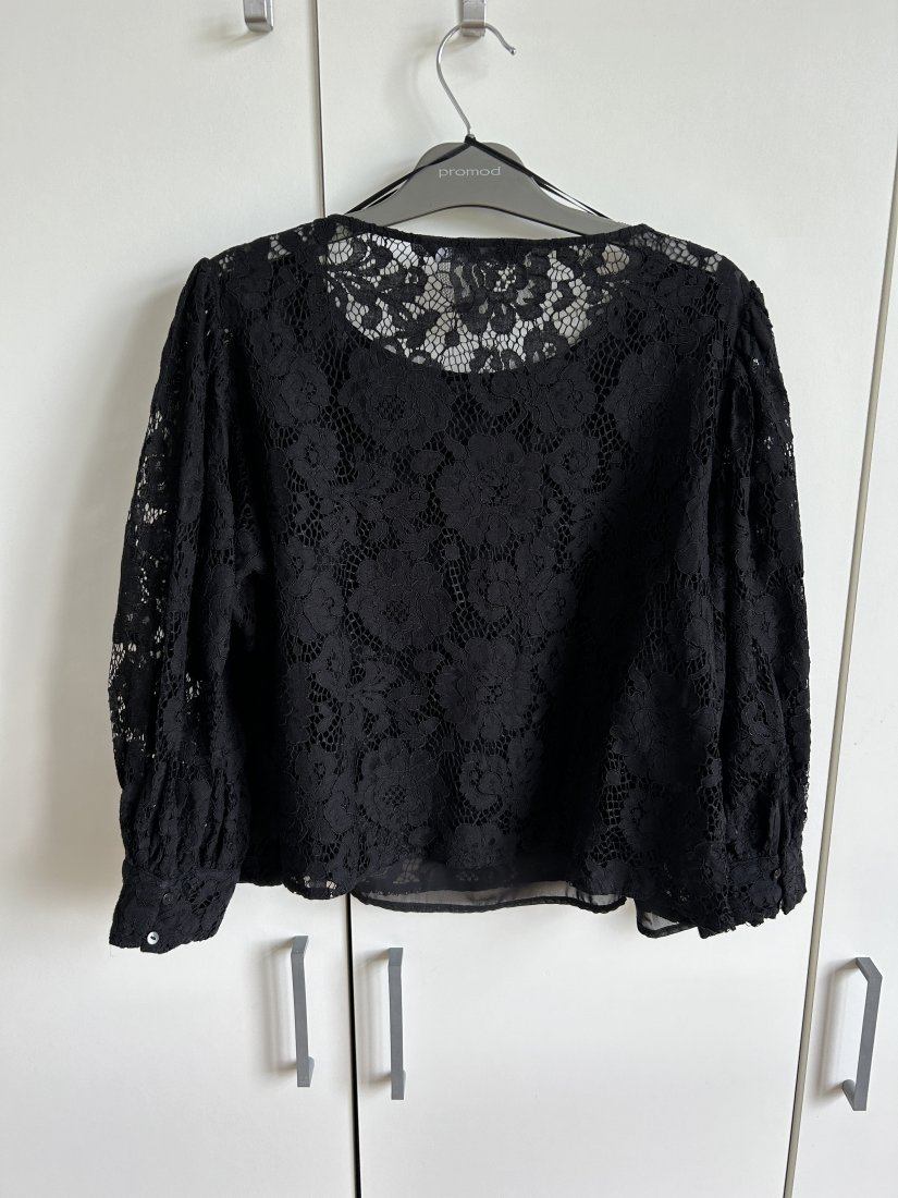 Czarna bluzka z koronkowej tkaniny. Z przodu podszewka. Krótszy fason. Bufiaste rękawki 3/4. Stan bardzo dobry.