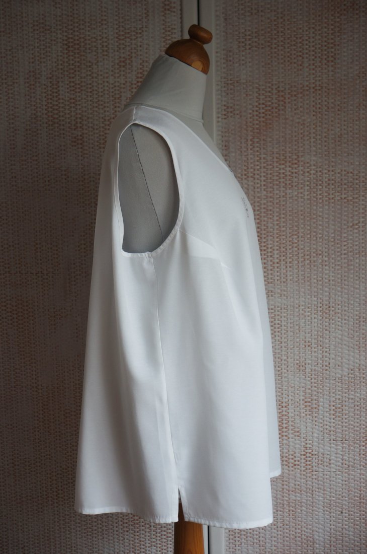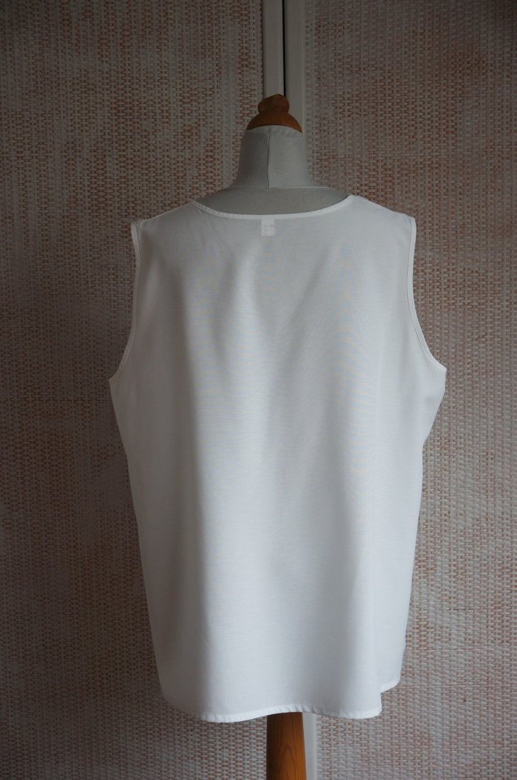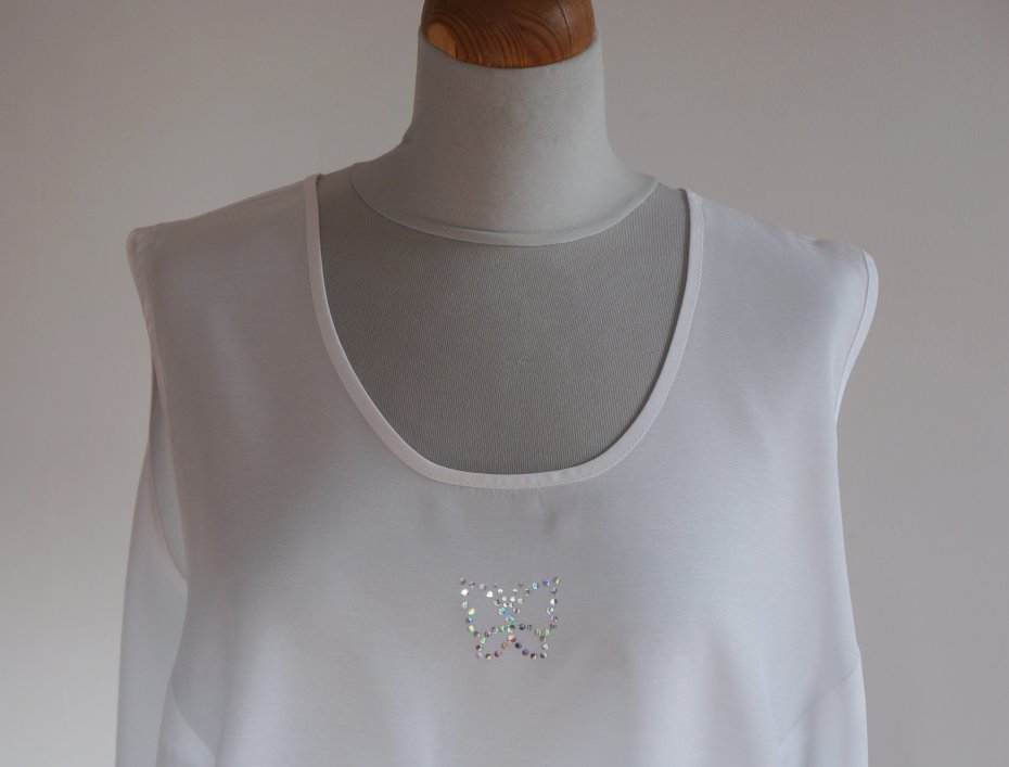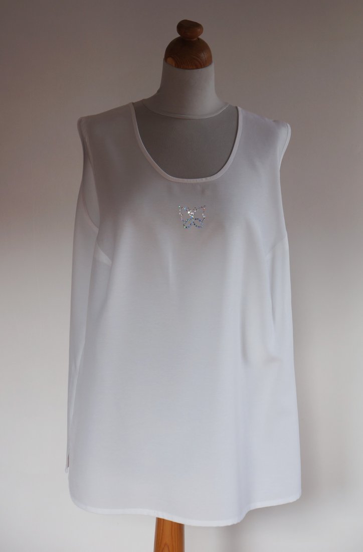 Damska, biała bluzka. Bezrękawnik. Na piersi ozdobiona konturem motylka w srebrnym kolorze. Po bokach krótkie rozcięcia o długości 6,5 cm. Tkanina delikatna żorżeta. Stan bardzo dobry.