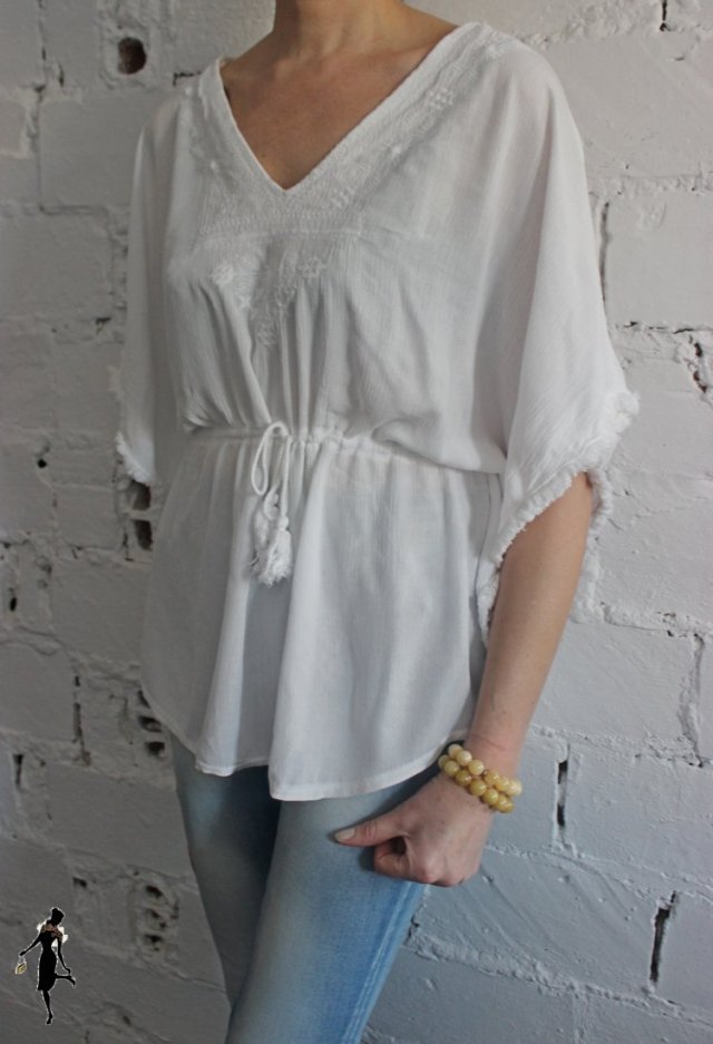 Bluzka biała z ozdobnym dekoltem. Rozmiar uniwersalny. Wymiary: obwód biustu-66cmx2 (mierzony od pachy do pachy), obwód pasa-65cmx2 (regulowany gumką i sznureczkiem), długość przodu bluzki-71cm, długość tyłu bluzki-82cm. Skład materiału: 100% wiskoza.