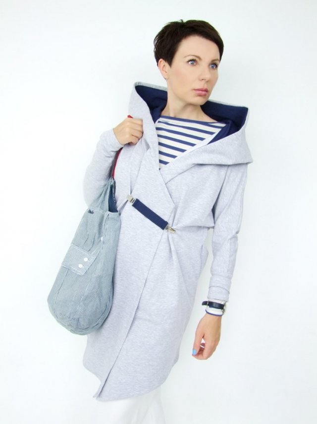 Luźny Bluza okrywacz z bardzo dużym kapturem w kolorze szarym wykonany z dzianiny dresowej bawełnianej polskiego producenta, wypełniony granatowym wnętrzem lub do wyboru wg życzenia innym kolorem wnętrza kaptura zapinany na ozdobną klamrę rozmiar uniwersalny 36-40